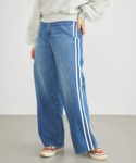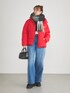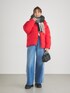 冬のお出かけにぴったりな中綿アウター! 人混みの中でも目立つ赤色にボトムはラインデニム👖 配色のマフラーで防寒対策もバッチリ🧣