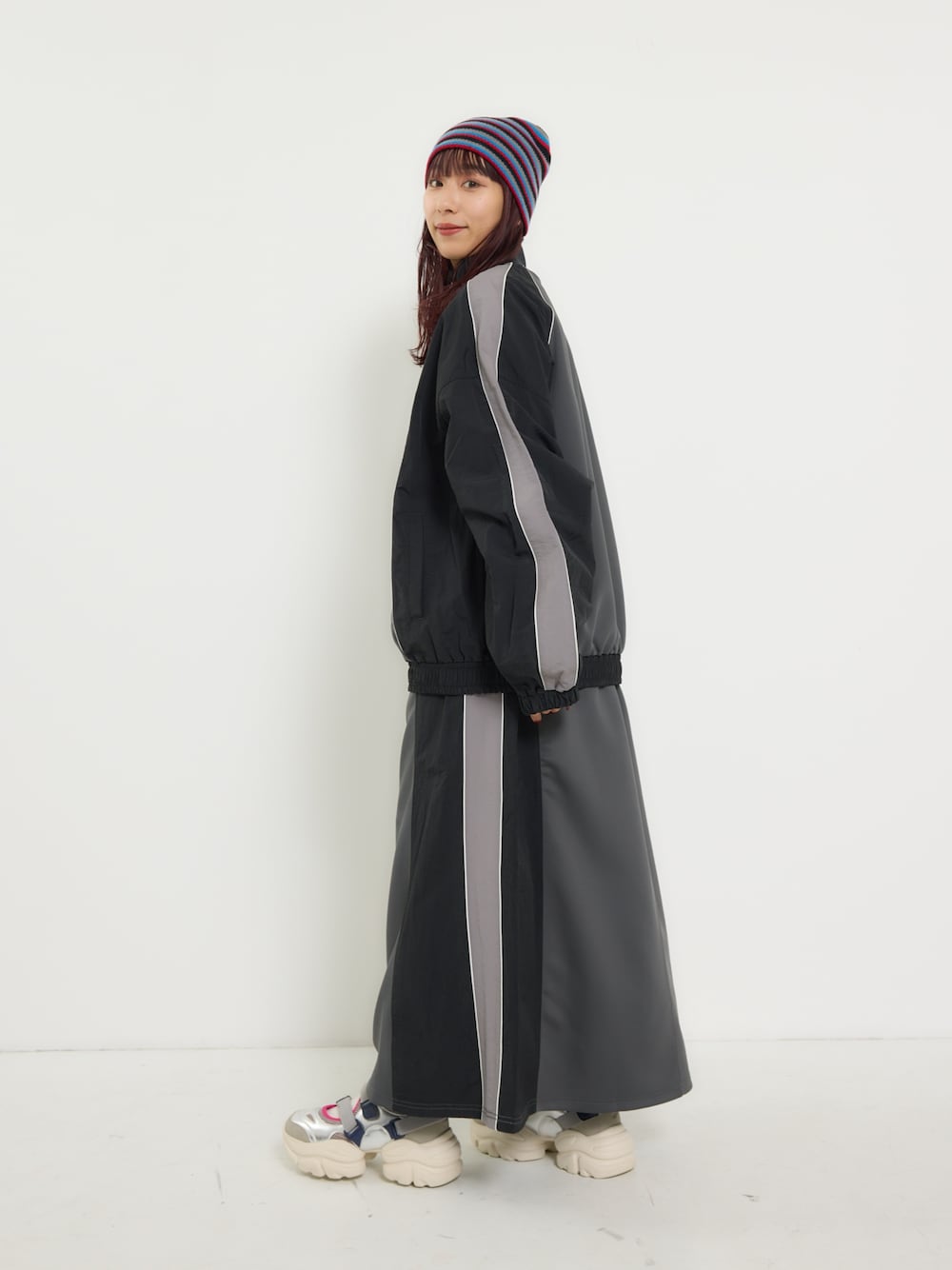 セットアップで着たいナイロンジャケットとスカート✨ 帽子やスニーカーをワンポイントにすることで、よりオシャレ見えするよ♪