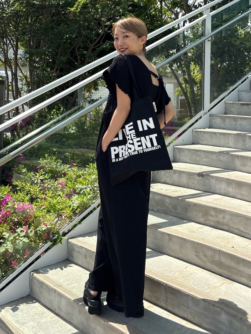 大人カジュアルに着られるオールインワン。 キャミを合わせて背中をヘルシー見せ♪ モノトーンコーデや、バッグやアクセにカラーアイテムを持ってきても◎