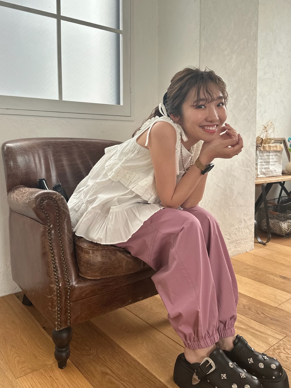 スポーティな印象のジョグパンツにレースキャミを合わせてスポーツ×ガーリーコーデ♡ 足元はあえてスタッズサボに✨