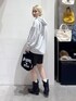 スウェットワンピをそのままブーツでコーデ! フェイクレザーショートパンツにボトムインして、ゆったりめなトップスとしても◎ 2通りの着方ができるよ!