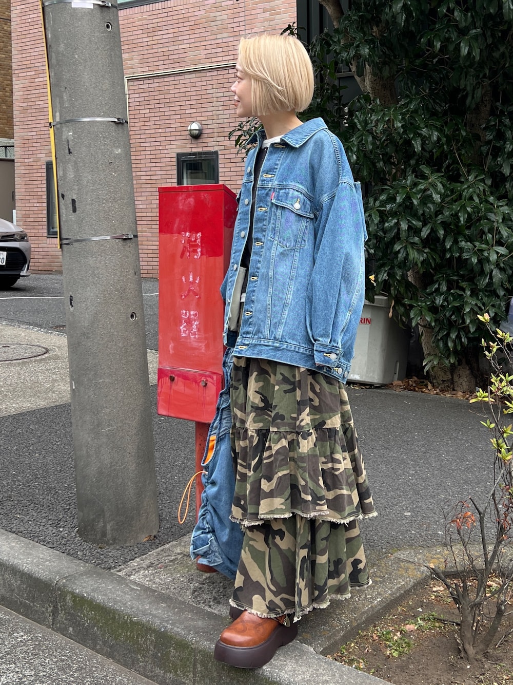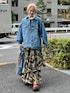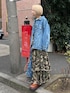 人気のカモ柄スカートはミリタリーだけどガーリーな着こなしに♡ 足元はハート♡のデザインがオシャレなサボ! デニムジャケットで春っぽいデザインに!