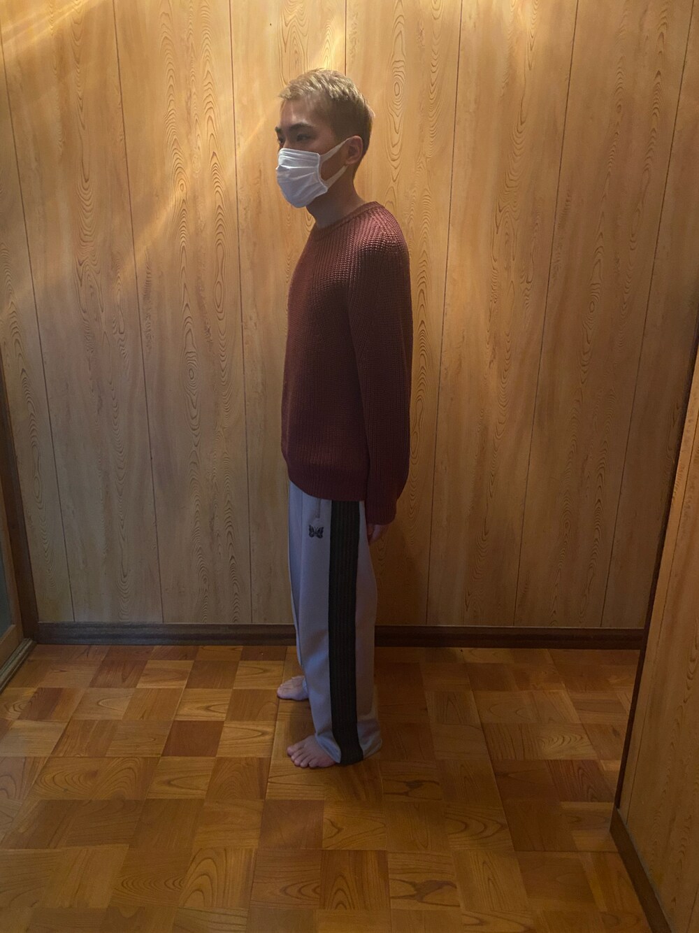 暗くて分かりづらいですが、needlesのトラックパンツが、ブラウンのラインが入っているので ブラウンのニットで、色を拾ってみました。