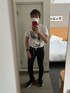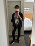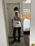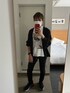 腕時計とスニーカーの配色が赤×黒で 合わせてみました。カーディガンとパンツも 黒で、Tシャツも赤の要素があるので 全体的に統一してます。