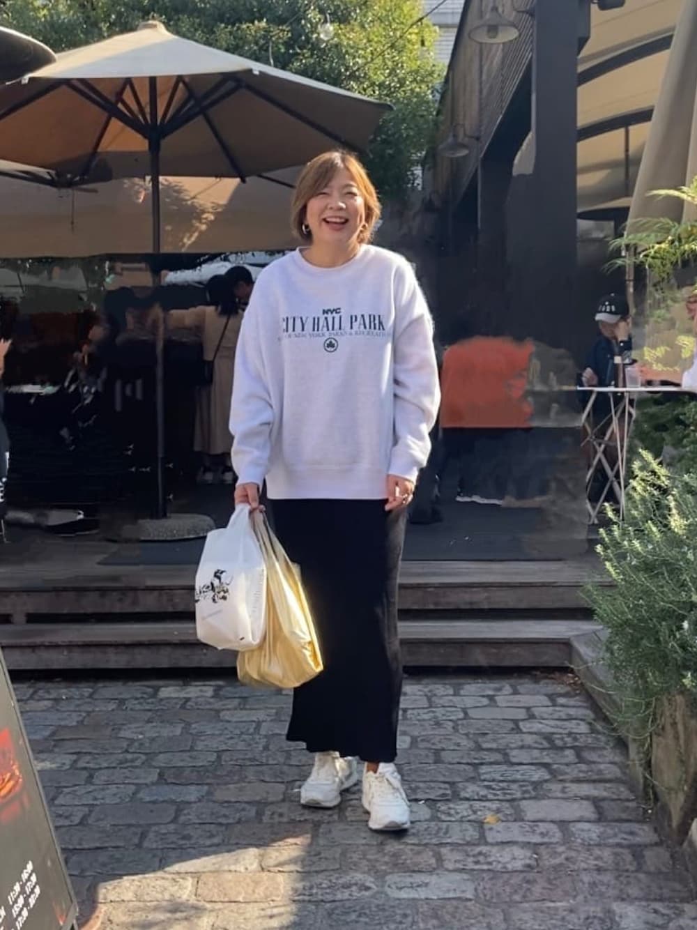 165cm/骨格ストレート/お腹ぽっこり 楽ちんコーデ! 骨格ストレートやけど、このスウェットは 柔らかい素材やから上半身のボリュームを 抑えてくれる。 しかも、インしなくてもちょうどいい長さやから、 ぽっこりお腹も隠せるで! スカートは、痩せ見えリブタイトスカートの 38サイズを履いてますっ!