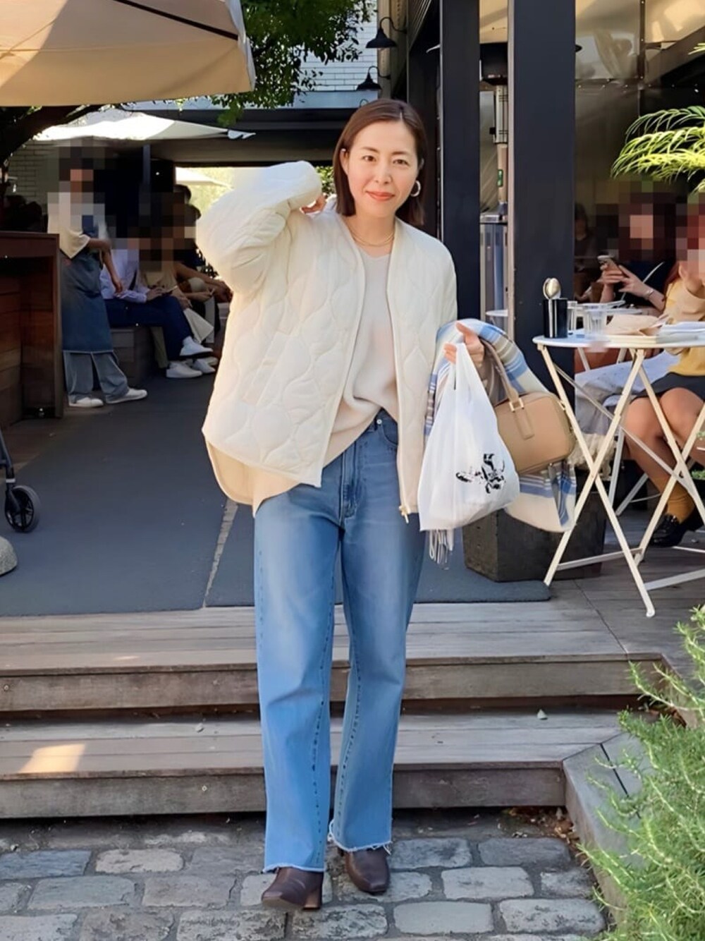 163cm/骨格ナチュラル/細め ●コート 軽くて暖かいキルティングコート。デイリー使いしやすいミドル丈で、長いシーズン使えます。 ●ニット ルーズなシルエットのふわふわニット。落ち感があるので着膨れせしません。 ●デニム ブルー36サイズ着用。ウエストや着丈はちょうどよく履けます。柔らかく締め付け感の少ないリラクシーな履き心地。 ◎キルティングをきれいめ見えなカジュアルコーデに。白×ライトベージュ、同系色のチェックストールで明るいトーンにしました。