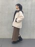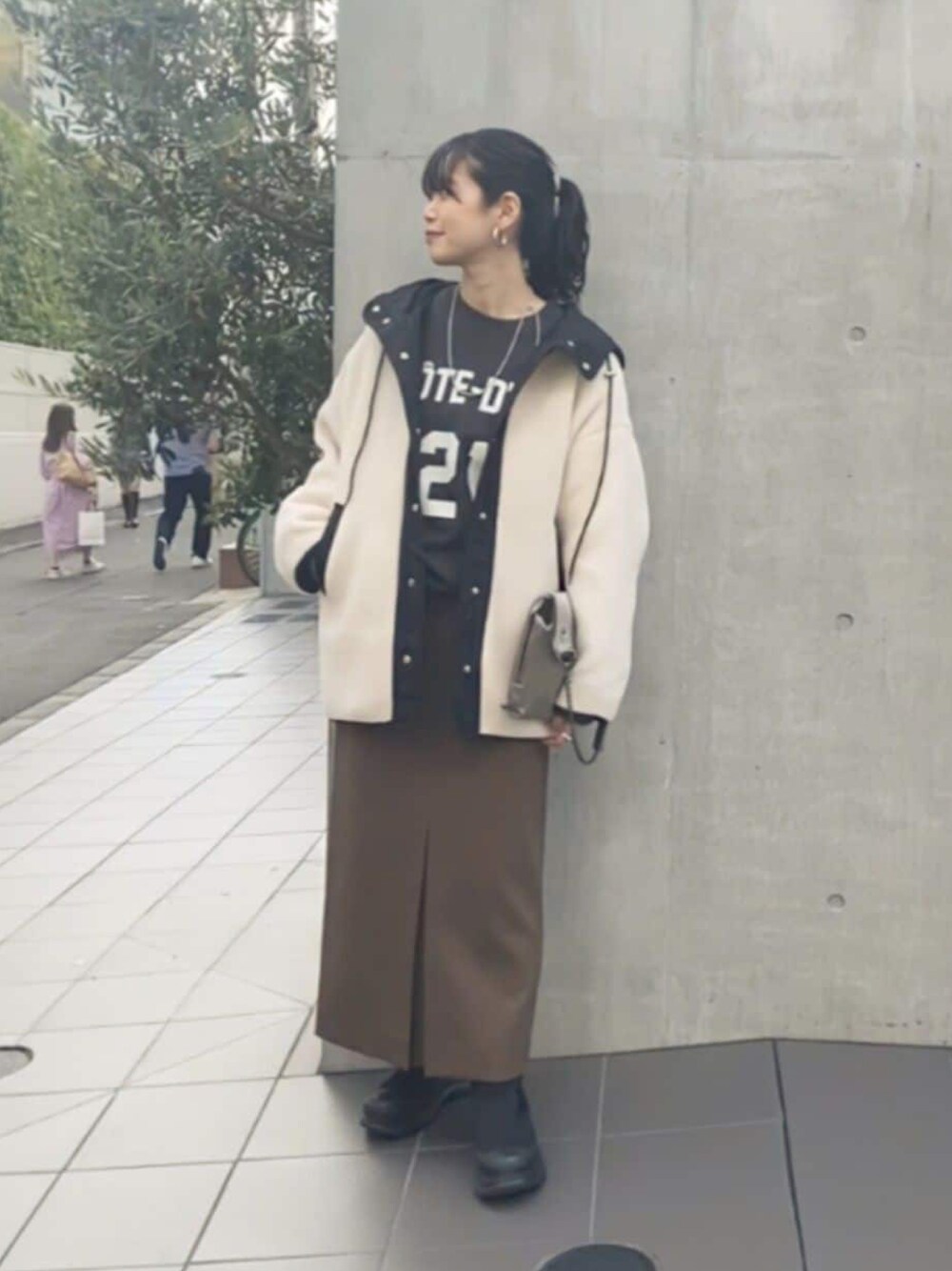 163cm/骨格ナチュラル/細め ボアコートを使ったデイリーコーデを組んでみました。 《ボアコート》 もこもこのボアがかわいいコート。ゆったりしたシルエットで厚手のニットも着込めるサイズ感です。 おしりが隠れる着丈もバランスが取りやすく、見た目より軽いのでとっても着やすいですよ! 《スウェット》 大きめのロゴがポイントのスウェットはシルエットがかわいい1枚。袖も少し膨らんだシルエットになっていて、女性らしい雰囲気になります。 おしりが半分ほど隠れる丈感でタイトスカートと合わせてもかわいいアイテムです。 《スカート》 サラッとした生地感が着やすいスカート。 わたしは38サイズを着用しています。ジャストウエストではなく少し落ちていますが、ぶかぶか感はなく着れています。 スリット付きで歩きやすく、ピッタリしすぎないサイズ感なのでニットタイトスカート等が苦手な方にもおすすめです。