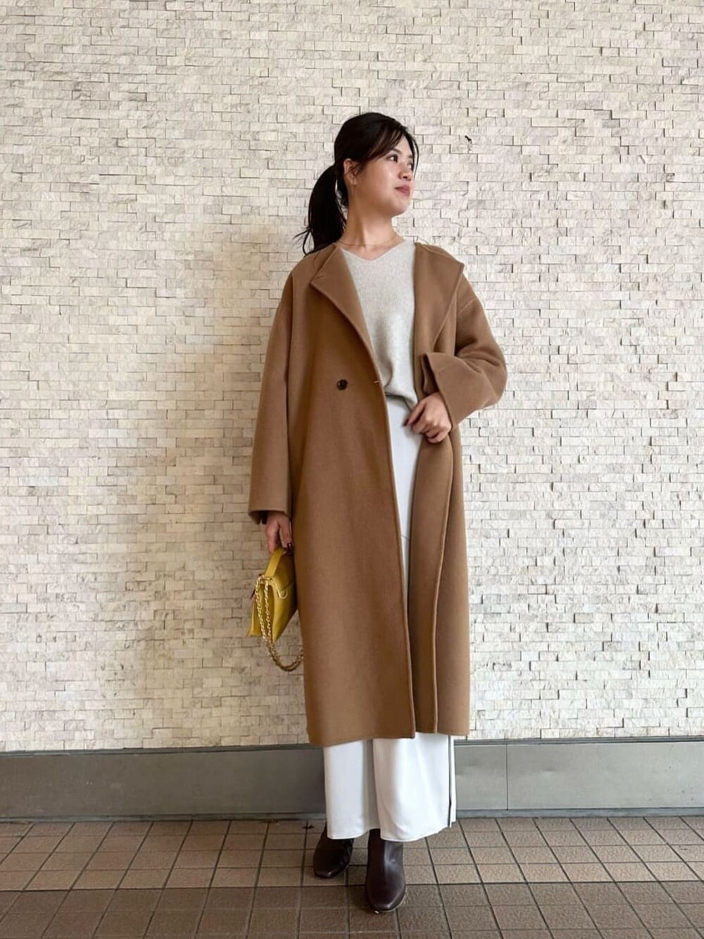 171cm 骨格ウェーブ とても軽く羽織れるコートスタイリング 落ち感のあるシルエットが素敵なコートはとても軽く、ボリュームが抑えられたシルエットなので華奢見えします。 襟ぐりはCネックにしているので、襟のあるシャツやニットの重ね着も楽々として頂けます。 袖裏だけ裏地付きなので腕通りがいいのも嬉しいポイントです。 インナーはワントーン合わせで。 美人見えのニットは着るだけで華やぎ、おしゃれ見えします。