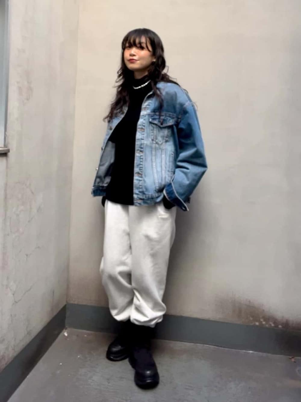 163cm/骨格ナチュラル/細め デニムジャケットとスウェットパンツのラフなこなれスタイルを組んでみました。 《デニムジャケット》 ロングセラーのMONNのデニムジャケットは、ゆったりしたサイズ感でラフな雰囲気で着れる人気アイテム。 オーバーサイズですが着られている感じは無く、厚手のニットやスウェットも着れるためロングシーズン着れてお得感しかありません! 《ニット》 ゆったりとしたシルエットが着やすいニットはカシミヤ入で暖かく着て頂けます。 首周りも窮屈すぎず、でもしっかりタートルのネック部分はよれたり形が崩れることがないので、とても着やすいです。 丈感はおしりが隠れる程度はあるため、インしてもしなくても着て頂けるアイテム。 手先は指ぬき穴がついているので、手の甲まですっぽり包まれて温かいですよ。 《スウェットパンツ》 MONNのスウェットパンツはゆったりとしたサイズ感で履き心地抜群。 やや明るめのグレーカラーはクリーンな印象になり、部屋着見えも軽減。 わたしはフリーサイズでそのまま履くと、足元で少したまります。ゆるっと履きたいときはそのままで、スッキリ見せたいときはウエストを一折して雰囲気を変えて履けるのでおすすめです。