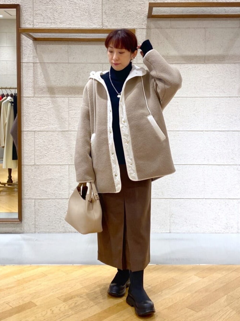154cm/骨格ストレート 大人が着てもしっくりくるカジュアルボアコート。 ゆったりとしたシルエットで中にも着込めるから冬にも大活躍します。 大人女子なコーデにはベージュのカラーが合わせやすくておすすめです!