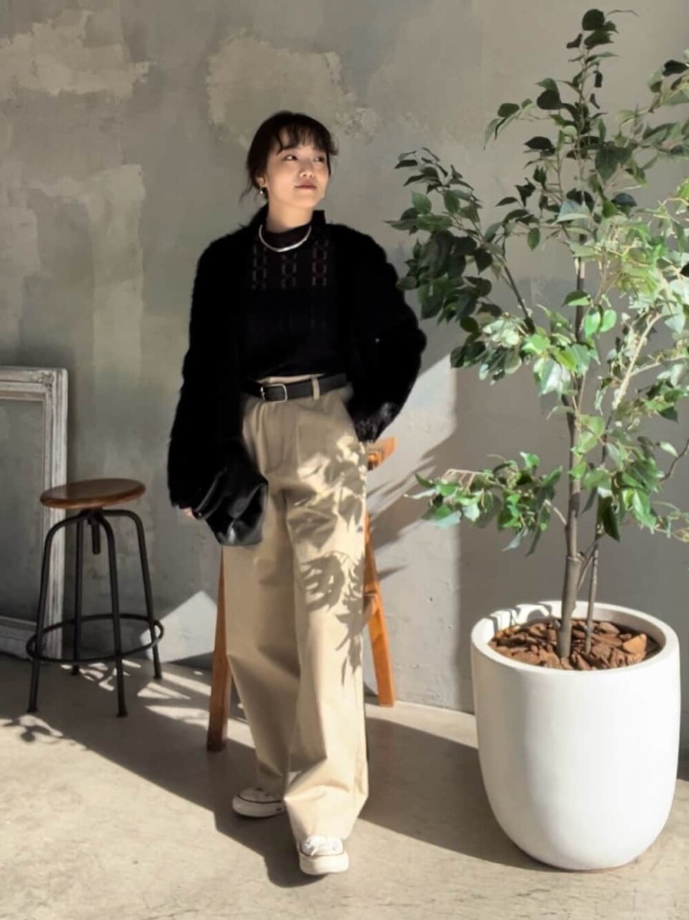 159cm/骨格ウェーブ/上半身細め、下半身腰ハリ ○ブラウス 少しストレッチのある素材で動きやすいです。 すっきりした印象で着られるので、女性らしいスタイリングにぴったりです。 ○カーディガン フェザーの柔らかい素材感が魅力のカーディガン。 カジュアルなコーデからオケージョンシーンにもおすすめです。