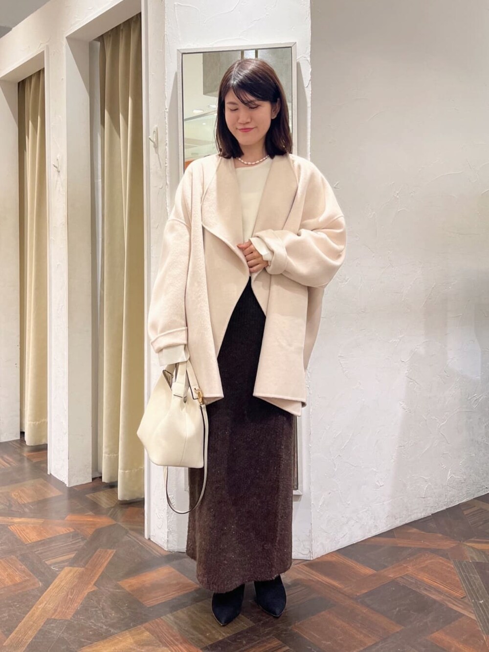 155cm ⚫︎アウター 着用カラー ライトベージュ 着用サイズ 36 ゆったりめでお尻はしっかり隠れる丈です! ポリエステルとウールの混合で、裏地無しです☆ 軽くて羽織りやすいです! 寒い日は中にインナーダウンを羽織るのもオススメです! ⚫︎トップス コンパクトめでゆったりが苦手な方にもオススメです! ノンウールなのでロングシーズン使いやすいです! サラッとしていて着心地抜群です◎ シンプル過ぎないデザインがお洒落見えしてくれます♪ ⚫︎ボトムス 155cmで折らないで足首が隠れる丈感です! 程よい厚さで暖かいです◎ ウエストがゴムで楽ちんです♪ ラメ感がポイントになってくれるのでシンプル過ぎないコーデが完成します!