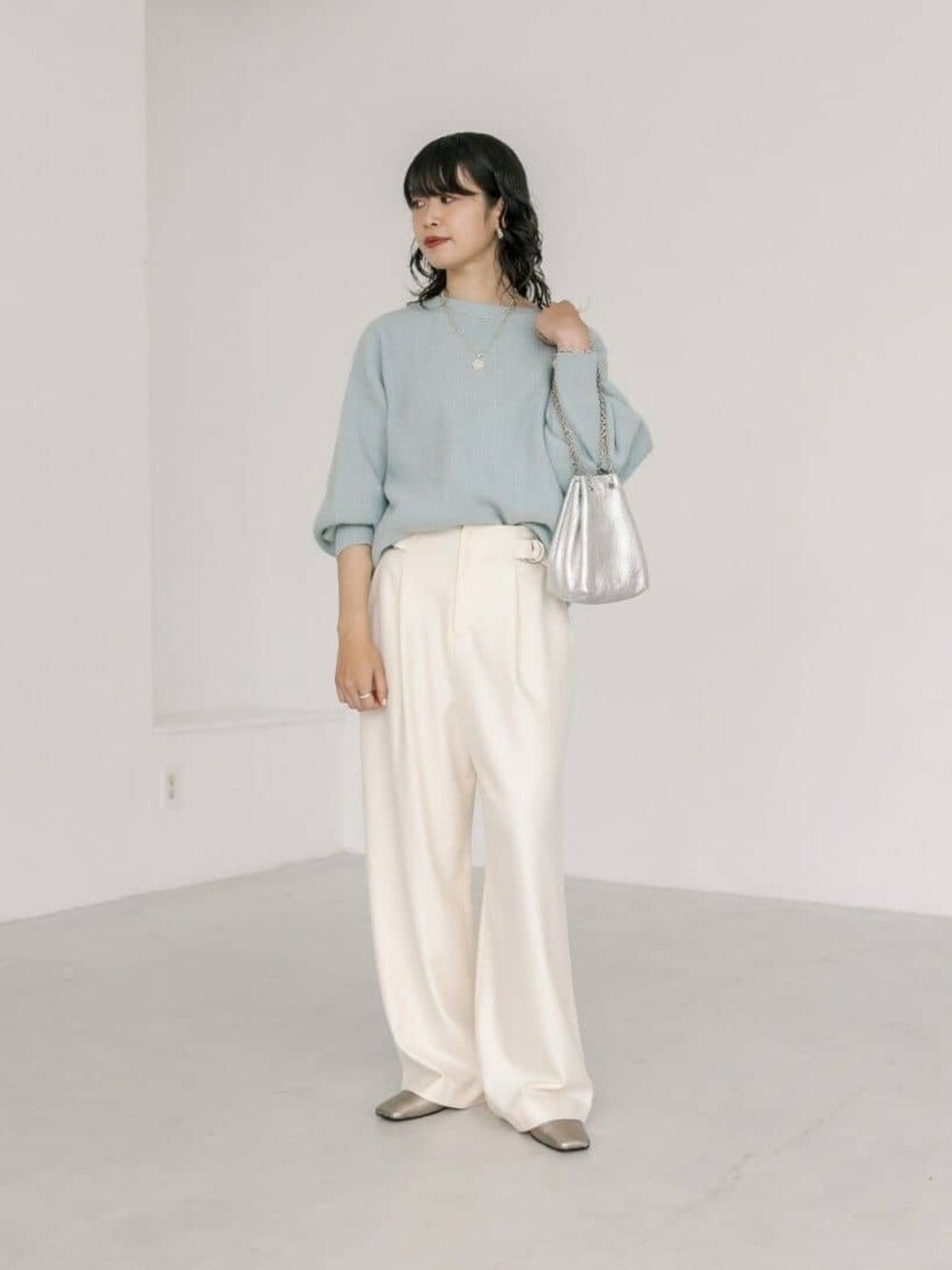 お出かけにもおすすめなニットコーデを組んでみました 《ニット》 こちらのニットは実はカーディガンで、前後逆にも着れる2WAY仕様になっています。 シルバーのボタンと、よーく見ると細かなラメが入ったニットは、さり気なく女性らしさがアピール出来るのがかわいい。 程よくゆったりしたシルエットで体のラインも拾わないのでリラックスした雰囲気で着て頂けます。 《パンツ》 ふわっとした起毛素材のワイドパンツ。程よい立体感でシルエットがとてもきれいです。 38サイズでフラットシューズでもジャストな丈感。フロント部分の両サイドについているベルトで多少のウエスト調整が効くので、好みのサイズ感に出来るのも嬉しいポイントです。