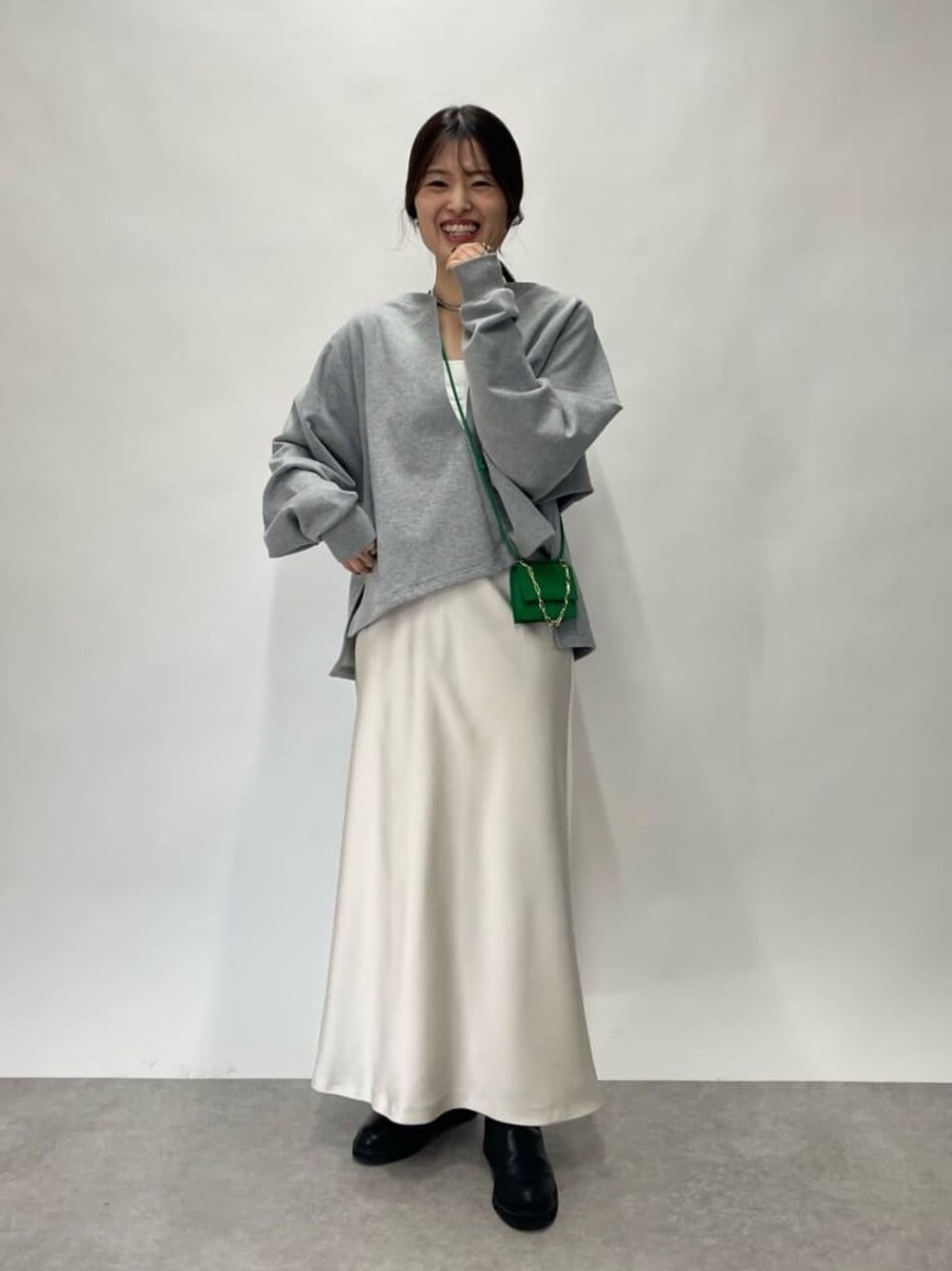 160cm/骨格ウェーブ スウェットはサテンのスカートと合わせることで女性らしい印象に。 Vネックなのでレイヤードが楽しめるのも魅力。 私は中にキャミソールを着ていますが、ロゴTやシアーカットソーを合わせるのも可愛いです◎ スカートは38サイズを着用。 ツヤっとしたサテンがコーディネートを華やかにしてくれます♡