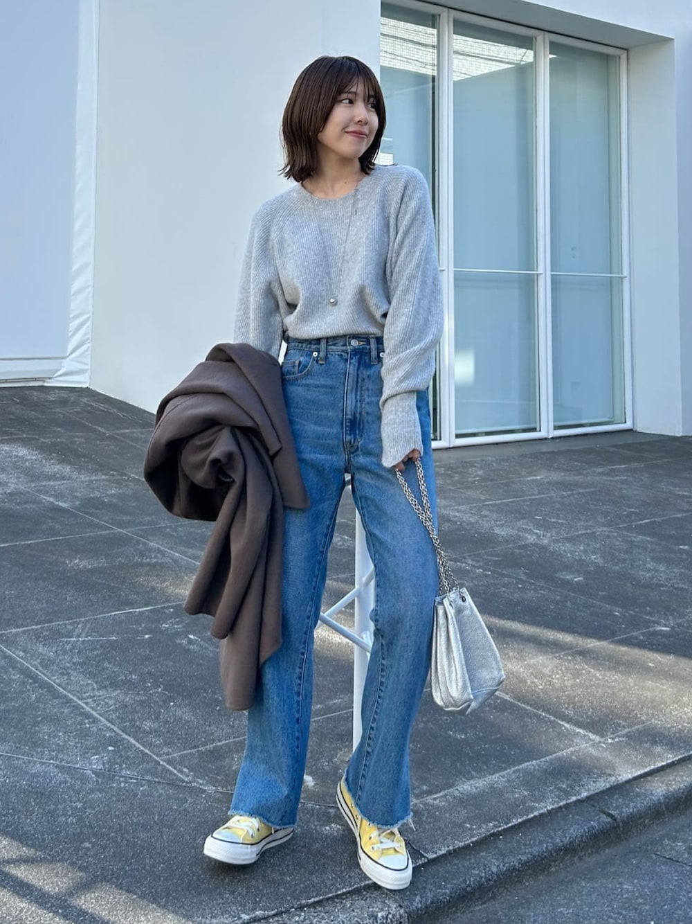 160cm/骨格ウェーブ 足元の黄色が映えるように デニムのシンプルコーデに。 デニムサイズ:36
