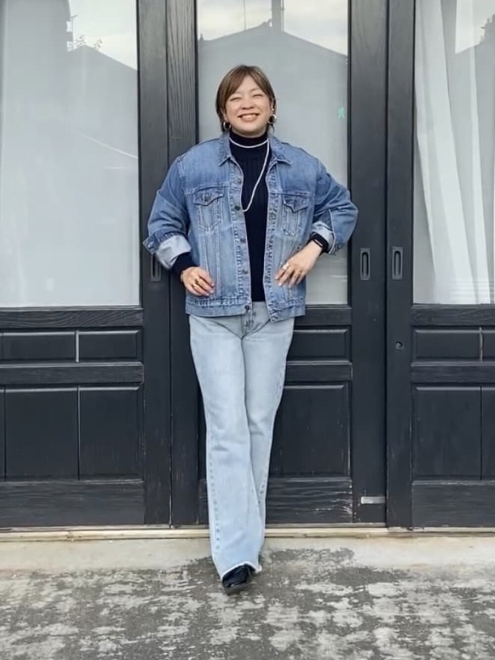 165cm/骨格ストレート/お腹ぽっこり デニム✖️デニムが、お気に入り! フレアデニムは38サイズを履いてますっ。 ニットにパール合わせるとキレイ目感出ていいかんじやでーっ。