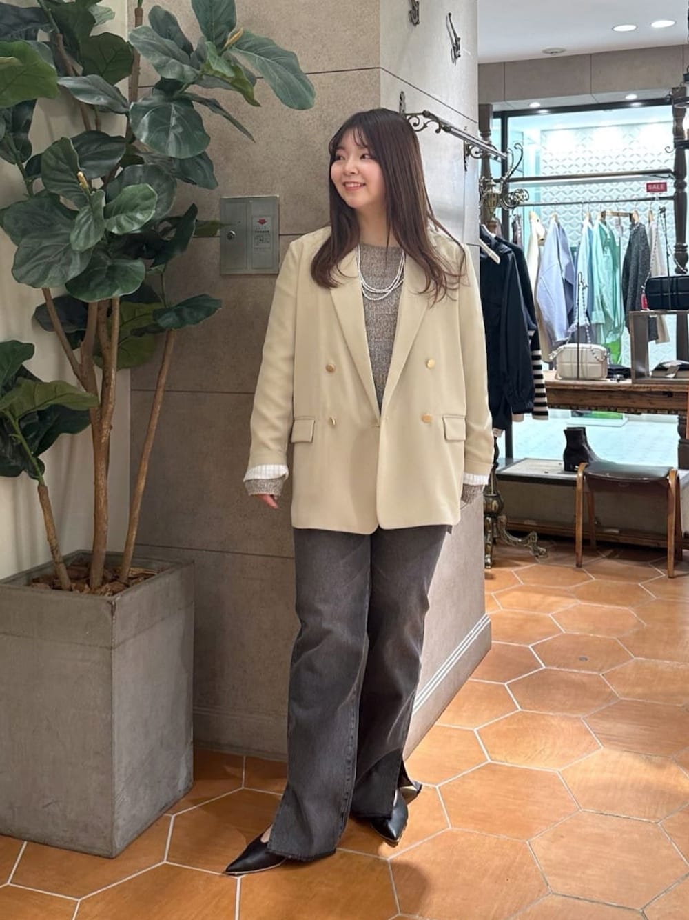 155cm / 骨格ウェーブ / ブルベ 柔らかくて着やすいジャケットが今年も登場! シワになりにくく軽いお作りです♡ 綺麗めスタイルはもちろん、デニムと合わせて少しカジュアルにするのもオススメです✨