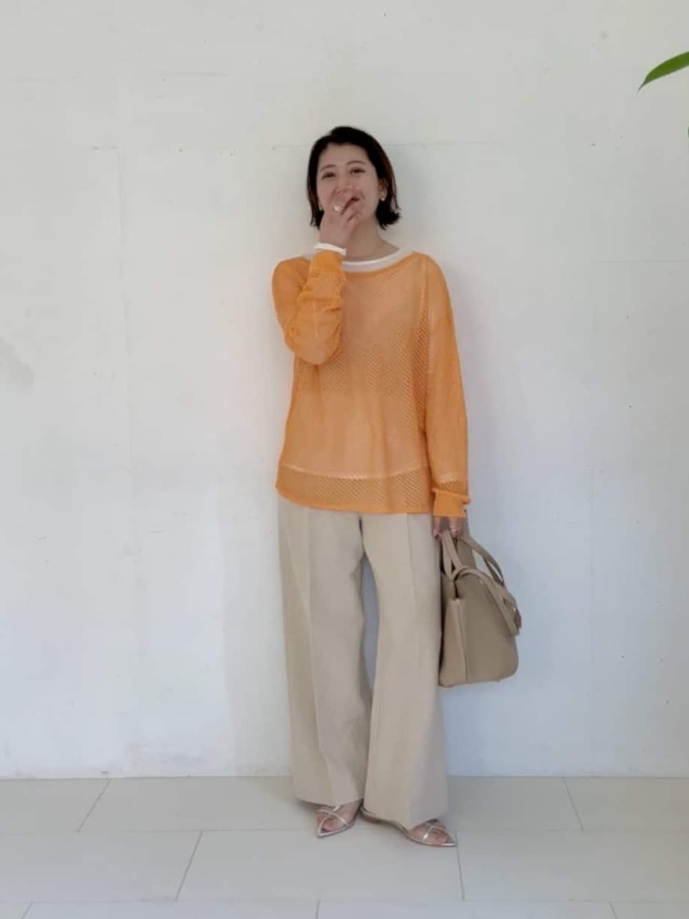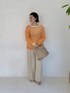 164cm/骨格ウェーブ/腰ハリ 【パンツ】サイズ38着用 間も無く予約がスタートするメッシュニットのオレンジ。フレッシュで爽やかな春夏らしい色合わせにしました♩ 春はロンTやシャツを、夏はノースリーブやベアトップをインナーにして長く楽しめそうです! ワイドパンツはとっても穿きやすく、腰張りな私でも楽々穿けました◎お仕事にも日常使いにもおすすめです。