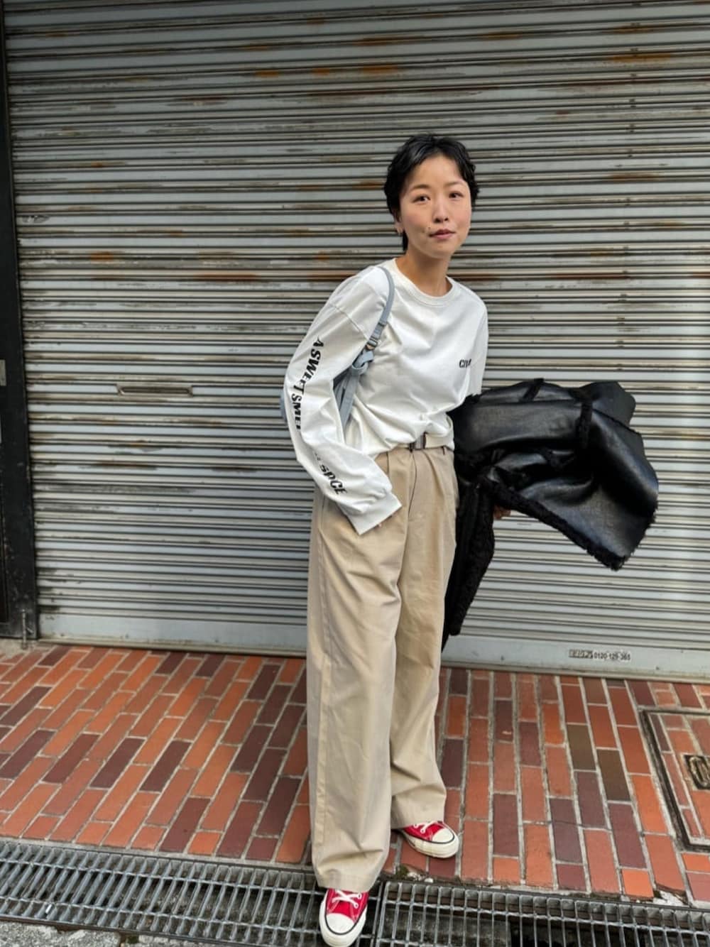 160cm/骨格ナチュラル ロンTeeは左胸、右袖、後ろの裾の3箇所にロゴが入っているデザイン。 ゆったりとしたサイズ感で、特に袖はタックが入っているので裾にボリュームがでます。 ボトムにはチノパンを。更にウエストにはガチャベルト合わせでカジュアルに。 カラーをシンプルにまとめるとカジュアルアイテム同士の組み合わせでも幼くなりません。 コンパクトなナイロンバッグでスマートな大人カジュアルコーデに。