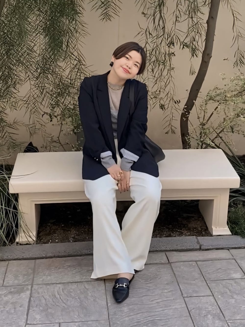 161cm/骨格ウェーブ 少しモードに着こなしたいときはカラーをモノトーンにまとめると◎ 重くなり過ぎないように面積広めなボトムスをあえて選んで、春らしい軽やかな印象をプラスしてます! すっきり見えるジャケットや縦ラインの効果があるロングコートで細見えも忘れずに!