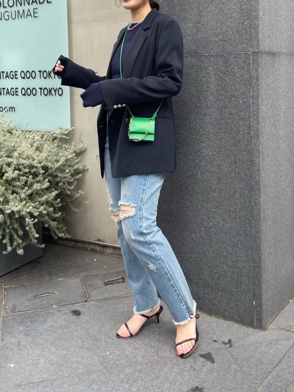 160cm/骨格ウェーブ ジャケット×デニムの春スタイル。 全体をブルーでまとめ、グリーンのバッグを差し色に♡ インナーのニットは着るだけでスッキリ見えが叶う着痩せニット。 伸縮性もあり程良く体にフィットします。 前後2wayで着られるのもポイント◎ デニムは36サイズを着用。 160cmで腰回りや着丈はジャストでした。 長めの着丈が好きな方や、少しずるっと履きたい方は38サイズがおすすめ◎
