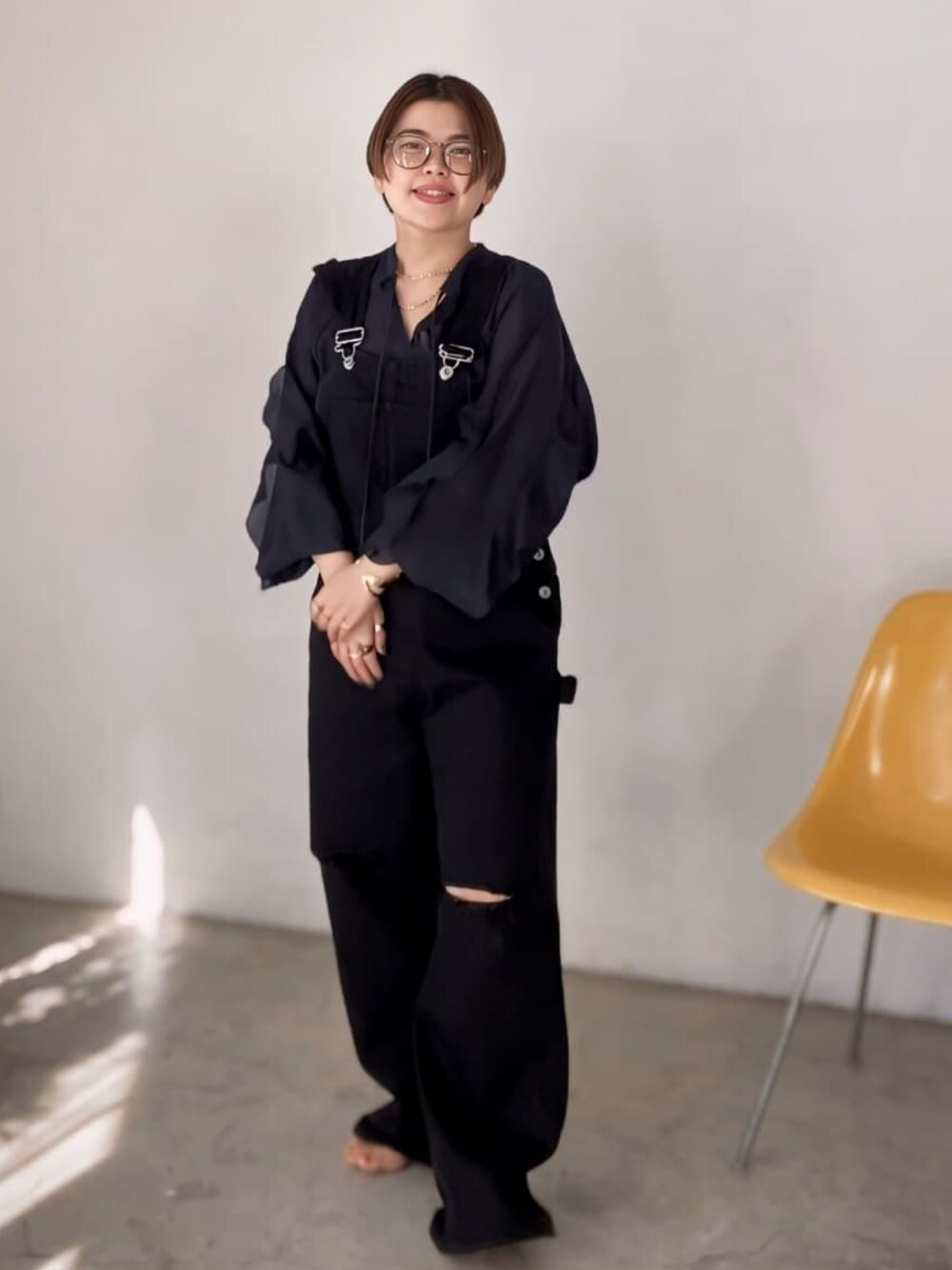 161cm/骨格ウェーブ カジュアルになりがちなオーバーオールはブラックを選ぶと取り入れやすい! インナーをブラウスにして女性らしさをプラス。 こうするとカジュアルになりすぎず、初めての方も取り入れやすくなります。