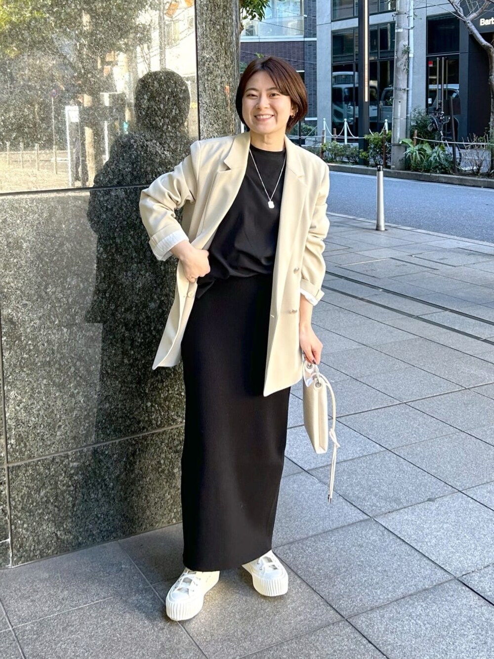 152cm/骨格ナチュラル ・ジャケットシワの気なりにくいポリエステルツイルを使用したON・OFF兼用で着用できるジャケットです。滑らかな素材感でより品のある雰囲気に。 ベーシックなデザインのため流行に左右されにくく、長くご愛用いただけます。 また、お袖を折り返しても素敵なデザインです。 ・ブラウス 滑らかな表面感のあるジョーゼット生地でお作りしたプルオーバーです。首元についたV字状の縫い付け(Vガゼット)がこなれ感をプラスし、大人カジュアルにもピッタリなデザイン。 カットソーのようにイージーな着心地でありながらキレイ見えするサラッとした素材感です。 ジャケットのインナーとしてはもちろん、春は一枚で着用頂くのもオススメです。 ・スカート36サイズ着用。軽く、柔らかな肌当たりで、シーズンレスで着用いただけるリブスカートです。スリットは前後どちらでも着用可能です。また、ウエストは総ゴムベルトのストレスフリーな着心地です。 ご自宅でのお手入れも可能な、デイリーに使いやすい万能スカートです。