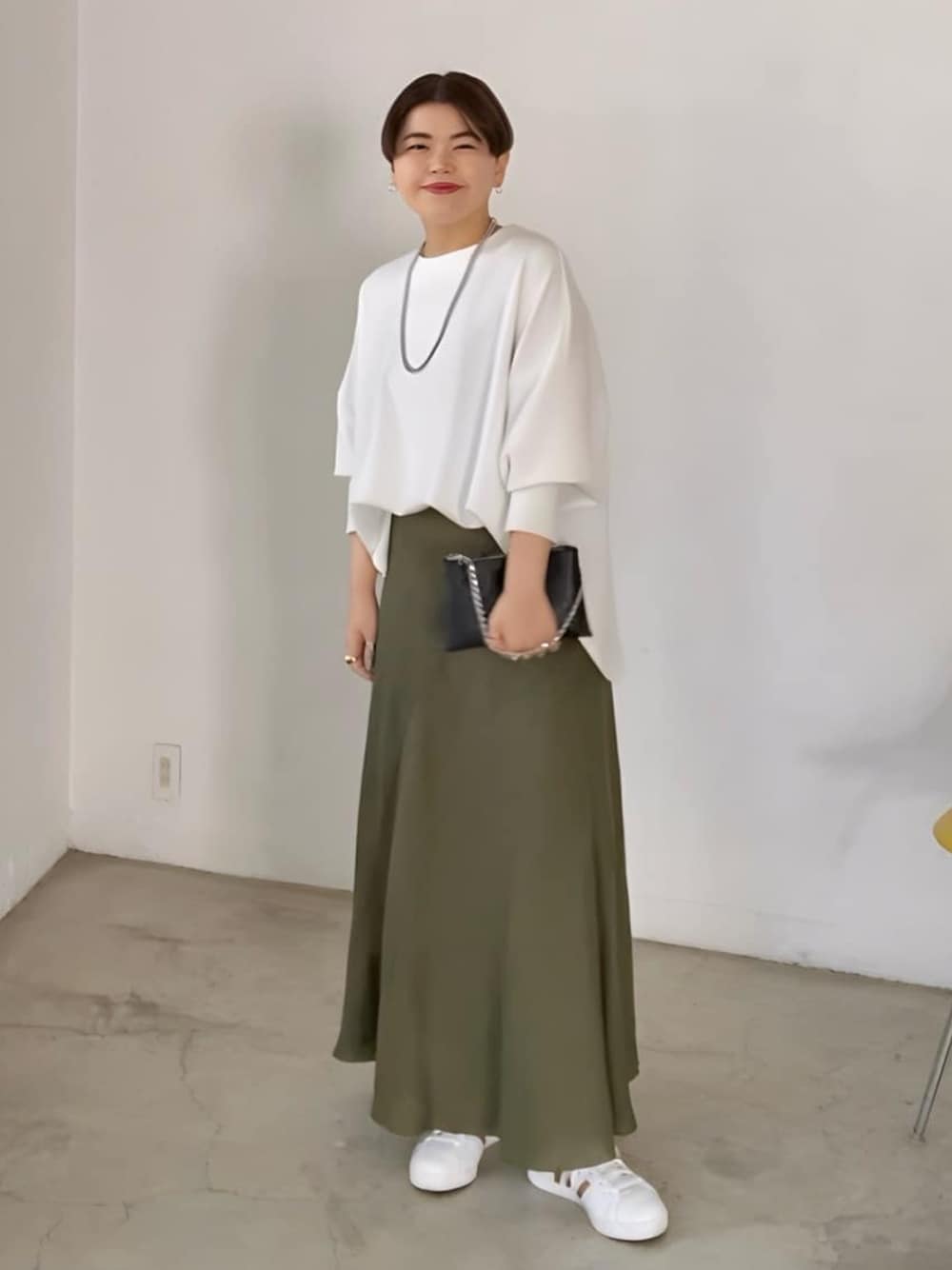 161cm/骨格ウェーブ マーメイドスカートでレディライクなカジュアルコーデ! 足元をスニーカーで外すことで、女っぽスカートを普段のコーデに取り入れられるようにしました! 夏はぺたんとした足元で合わせるのが◎