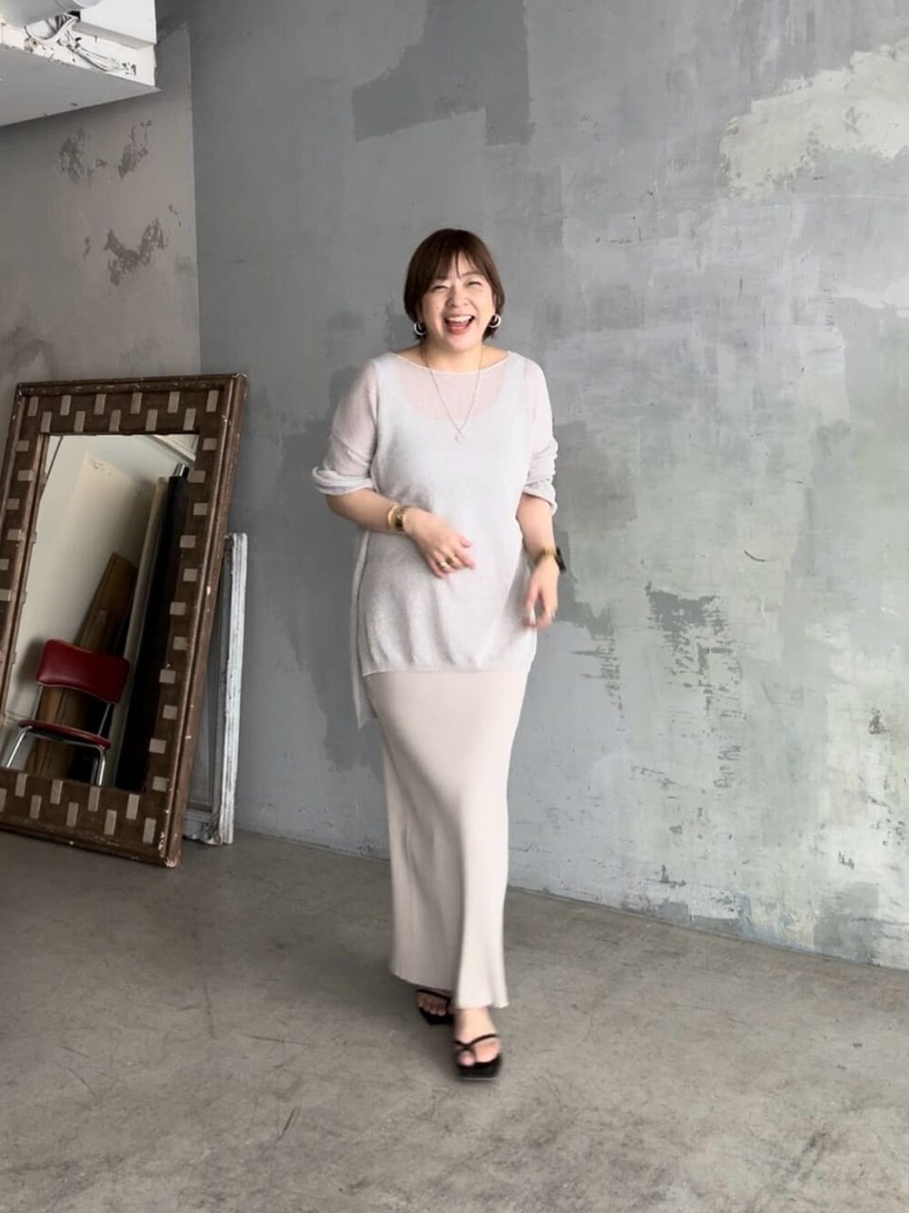 165cm/骨格ストレート 今年も人気! 真夏もいける、ペーパーガーゼニット ライトグレーを着てます。 スカートは、ベージュです。 淡いトーン合わせが好きです。