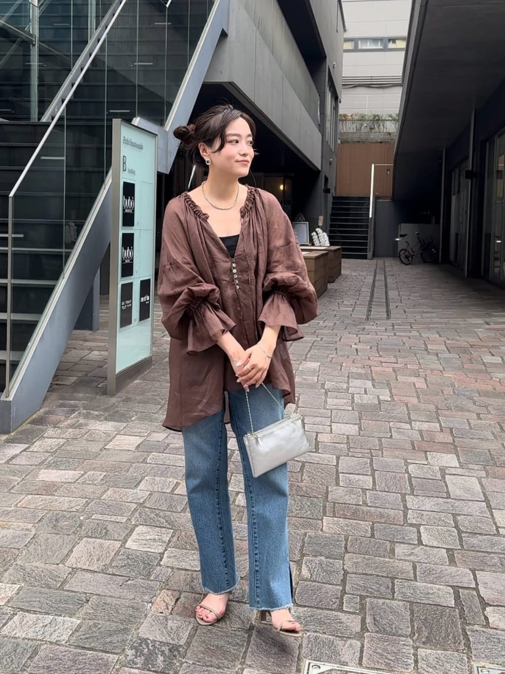 157cm 骨格ウェーブ リネンのブラウスがメインのコーデ ブラウン×デニムのカラーリングが夏らしい印象。 さらっとしていて夏も快適に着用いただけます。 ゆったり目でお腹周りもカバーできるので おすすめです。