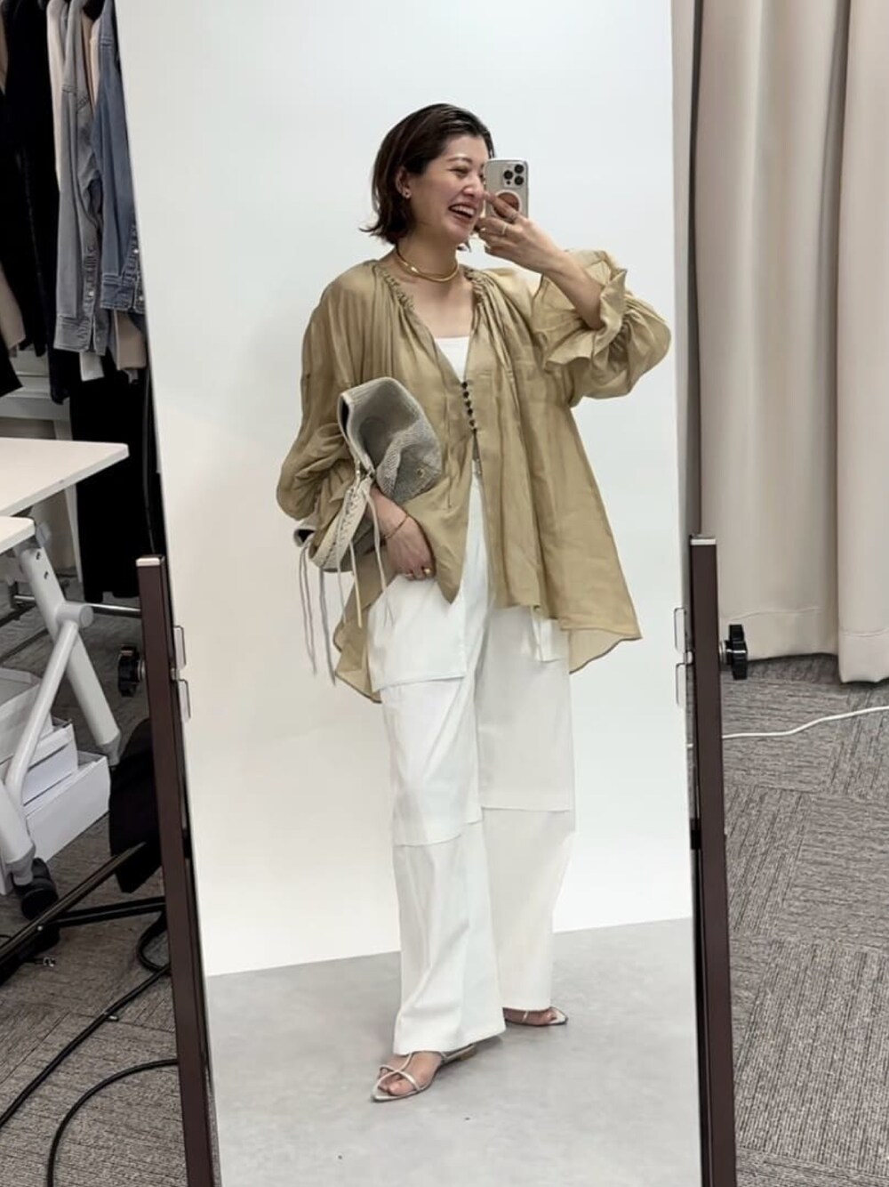 165cm 骨格ウェーブ 着るだけで華やかに仕上がるデザインブラウス。 ふんわりとボリューム感のあるシルエット。空気を纏ってとても涼しく着用いただけます。 ボトムはすっきりとしたデザインを合わせていただくのが◎ タイトスカートやIラインシルエットの合わせとしてもおすすめです。