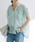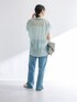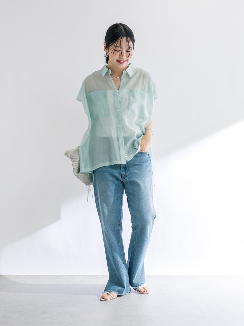 発色がきれいなツヤ感のあるシアーシャツ。 シンプルコーデも華やぎます。 デニムは36サイズを腰で履いています。