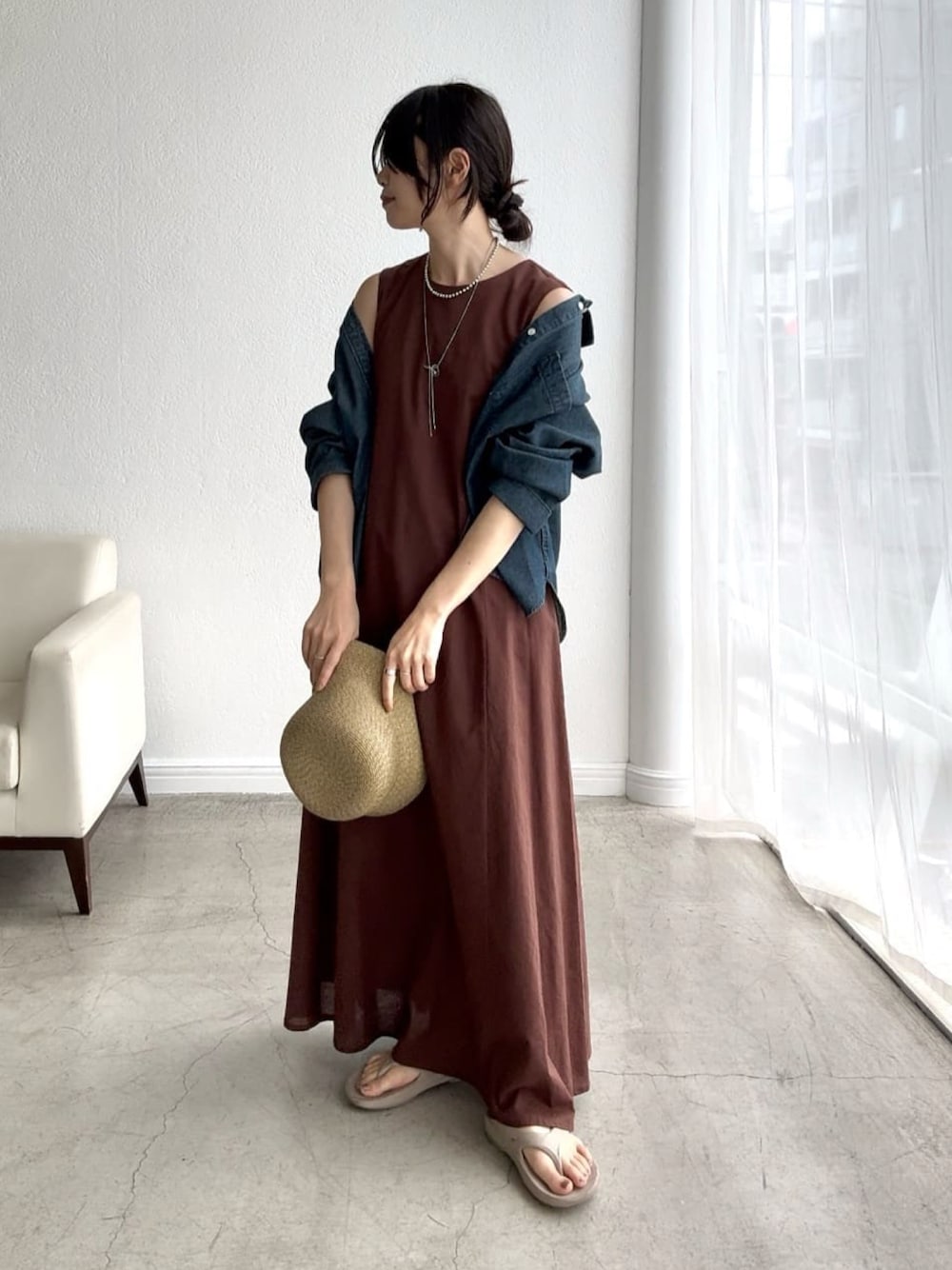 サラッとフレアなワンピース。38サイズ着用しています。 コックリとしたブラウンカラーはデニムとの相性も◎