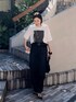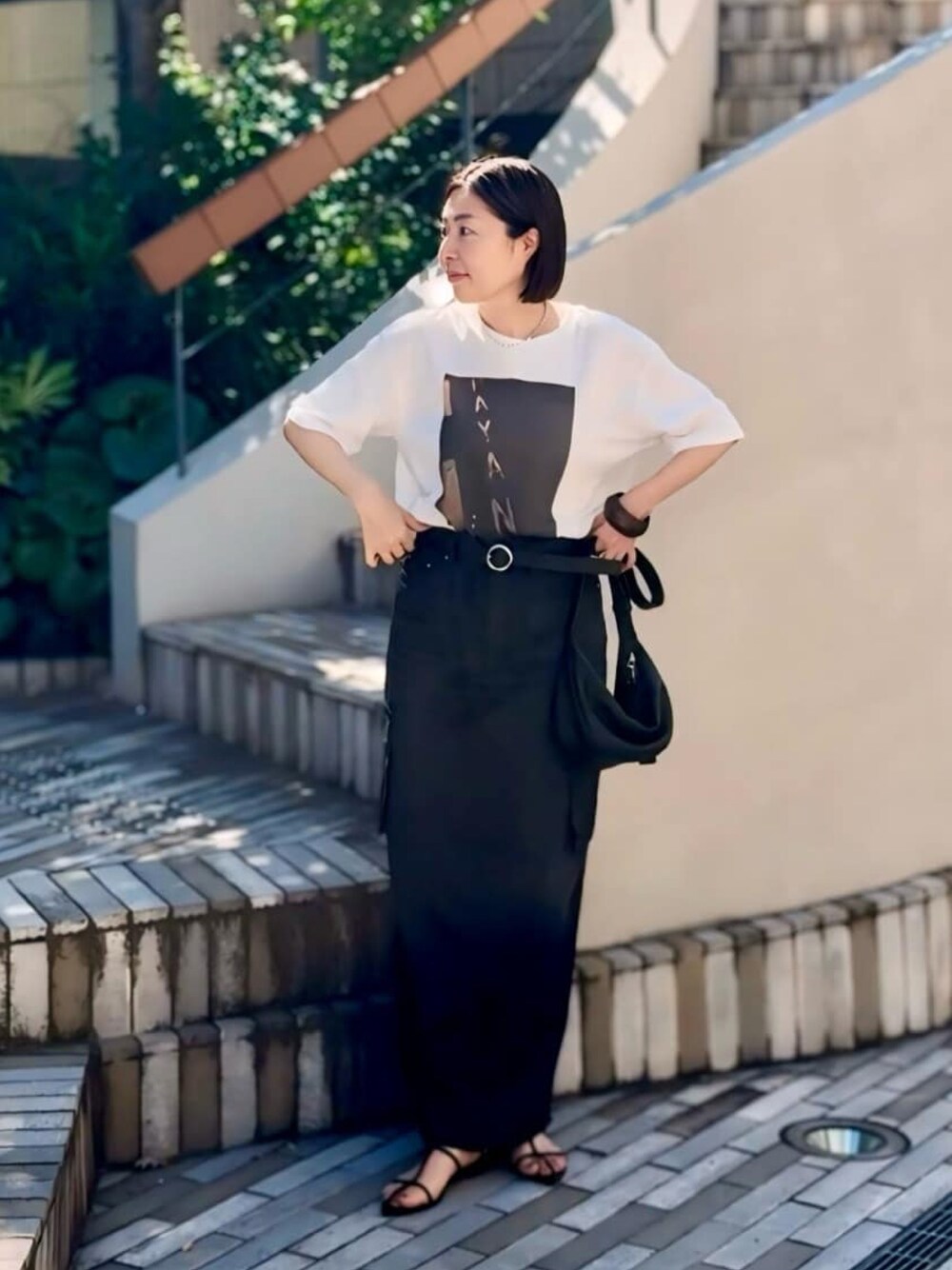 ●Tシャツ ゆるっとサイズで長めな袖丈。モード感のあるフォトプリントでシックに着れるTシャツです。 ●スカート 38サイズ着用。ウエストはゆったりめなウエストです。ライト素材のデニムスカート。夏も涼しく履けます。 ◎モノトーンで着る大人のTシャツコーデ。ベルトや華奢なサンダルで大人ムードな着こなしに。