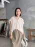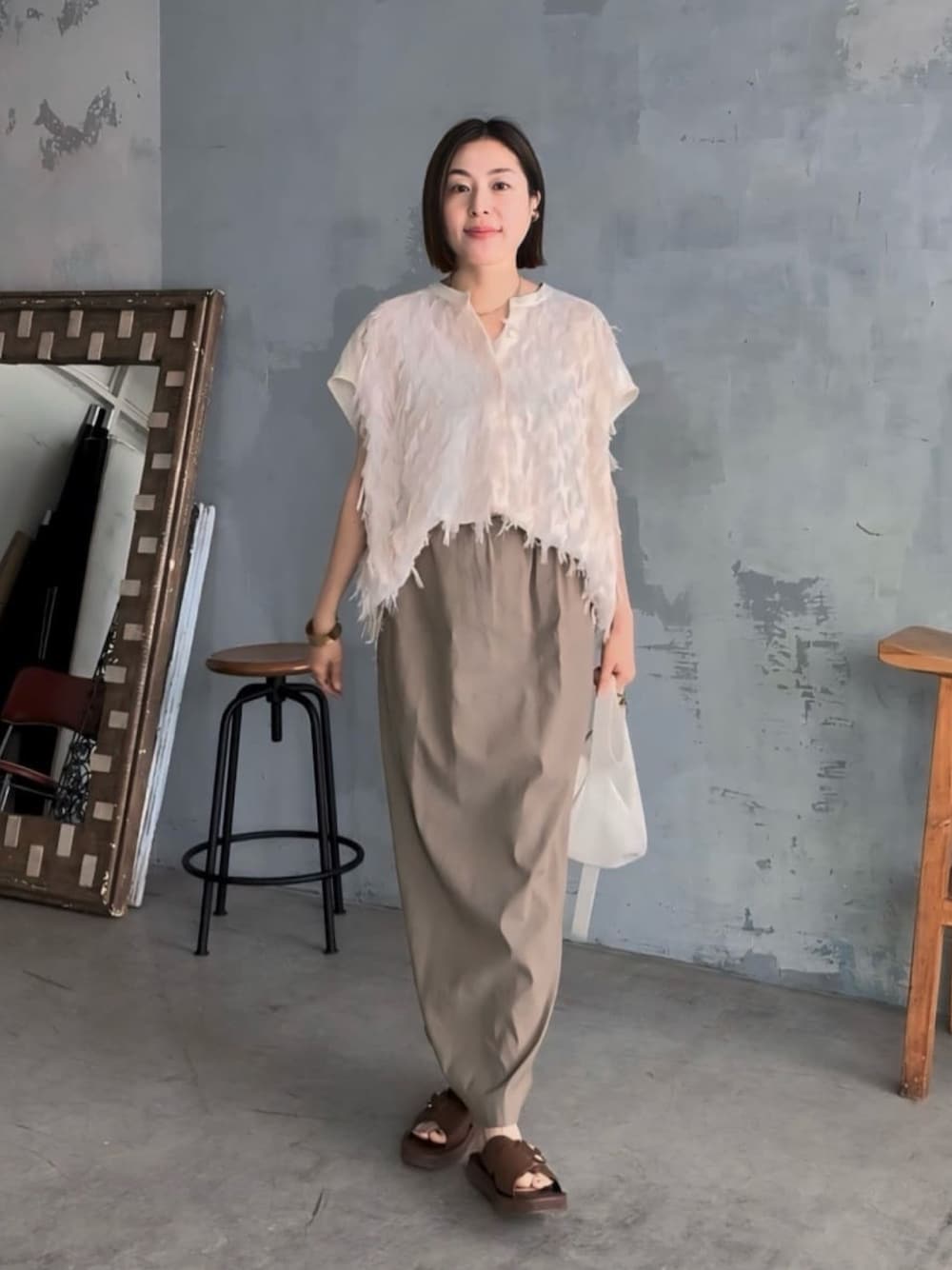 ●ブラウス ふわふわなジャガードブラウス。透け感があり、お洒落見えする一枚。体型カバーもしてくれます。 ●スカート 38サイズ着用。薄手で柔らかな履き心地。ストレッチも効いていて楽ちんです。タイトすぎないシルエットも◎ ◎甘めなブラウスをアースカラー合わせの大人コーデに。ボリュームのあるサンダルもポイント。