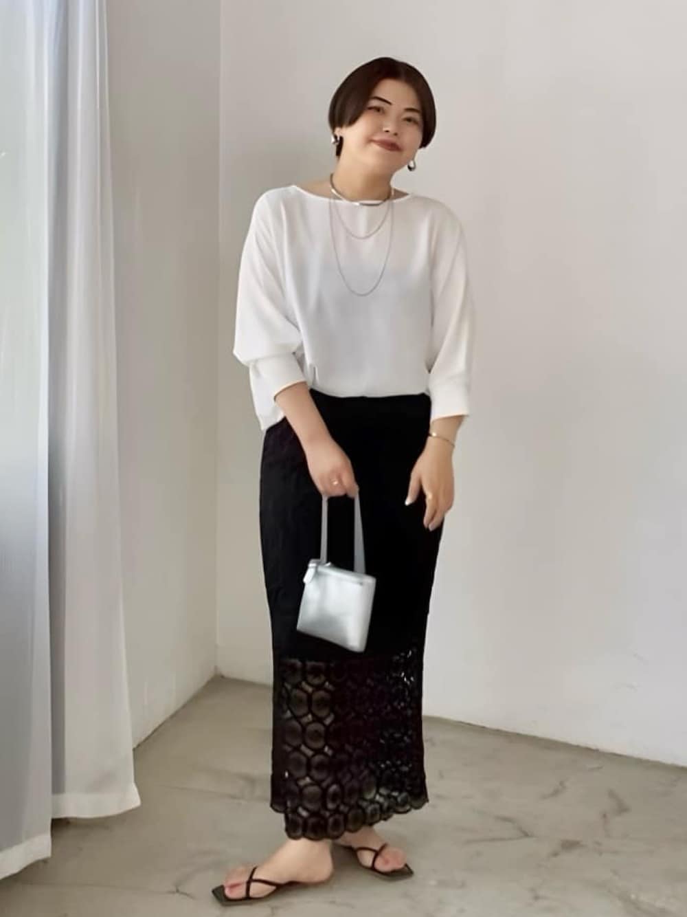 シンプルでもオシャレに見えるドルマンブラウス×レーススカート! 綺麗めになり過ぎないように小物で外すのがポイント!
