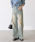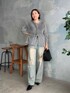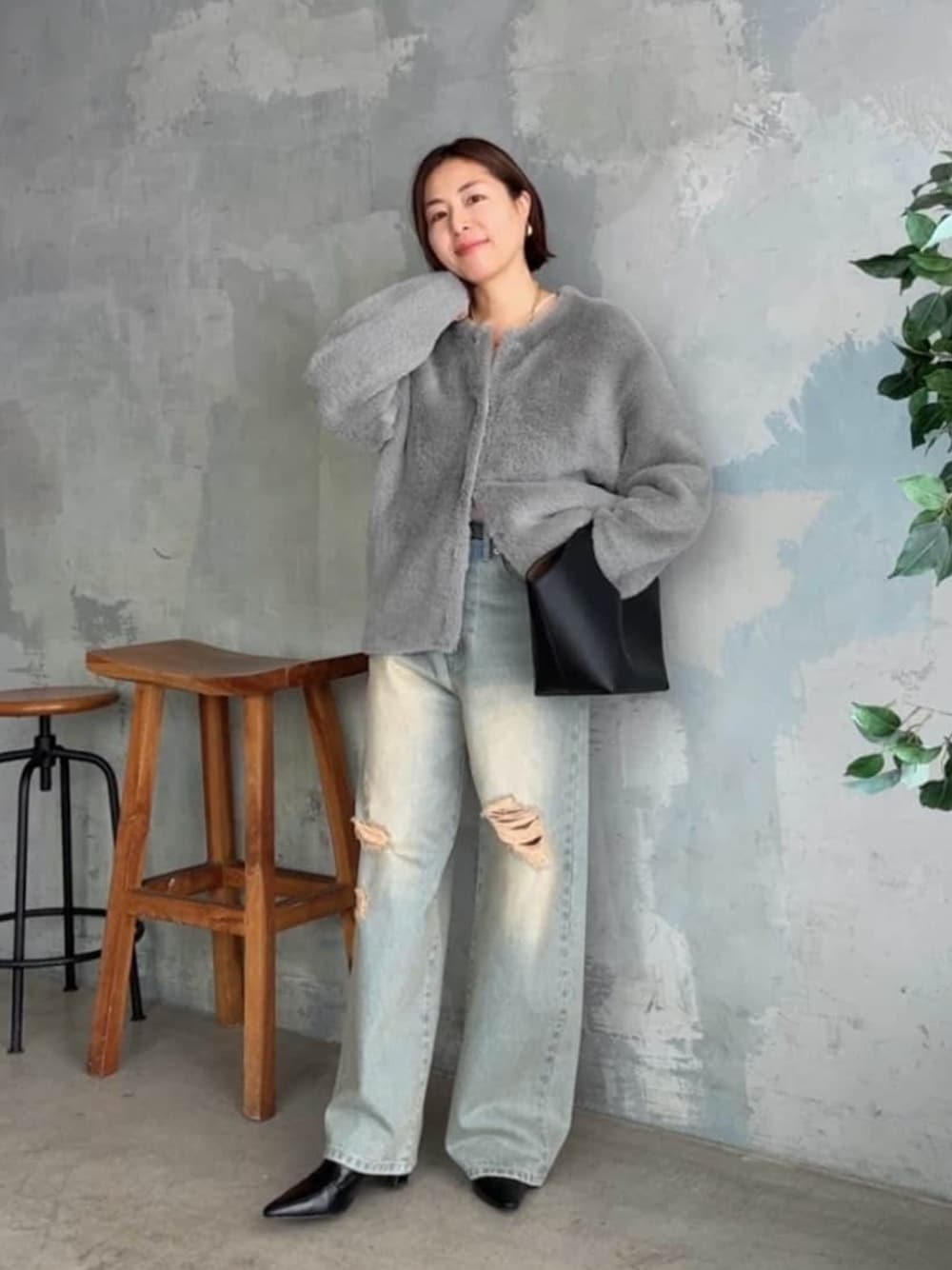 ●ニット なめらかな肌触りのシャギー素材カーデ。アウターみたいに羽織りとしても可愛いです。 ●デニム 38サイズ着用。ハイウエストのルーズデニム。こなれ感のあるカラーとダメージがポイント。 ◎着映えカーデをデニムでカジュアルに。グレー×ブルーの柔らかな色合いにしました。