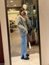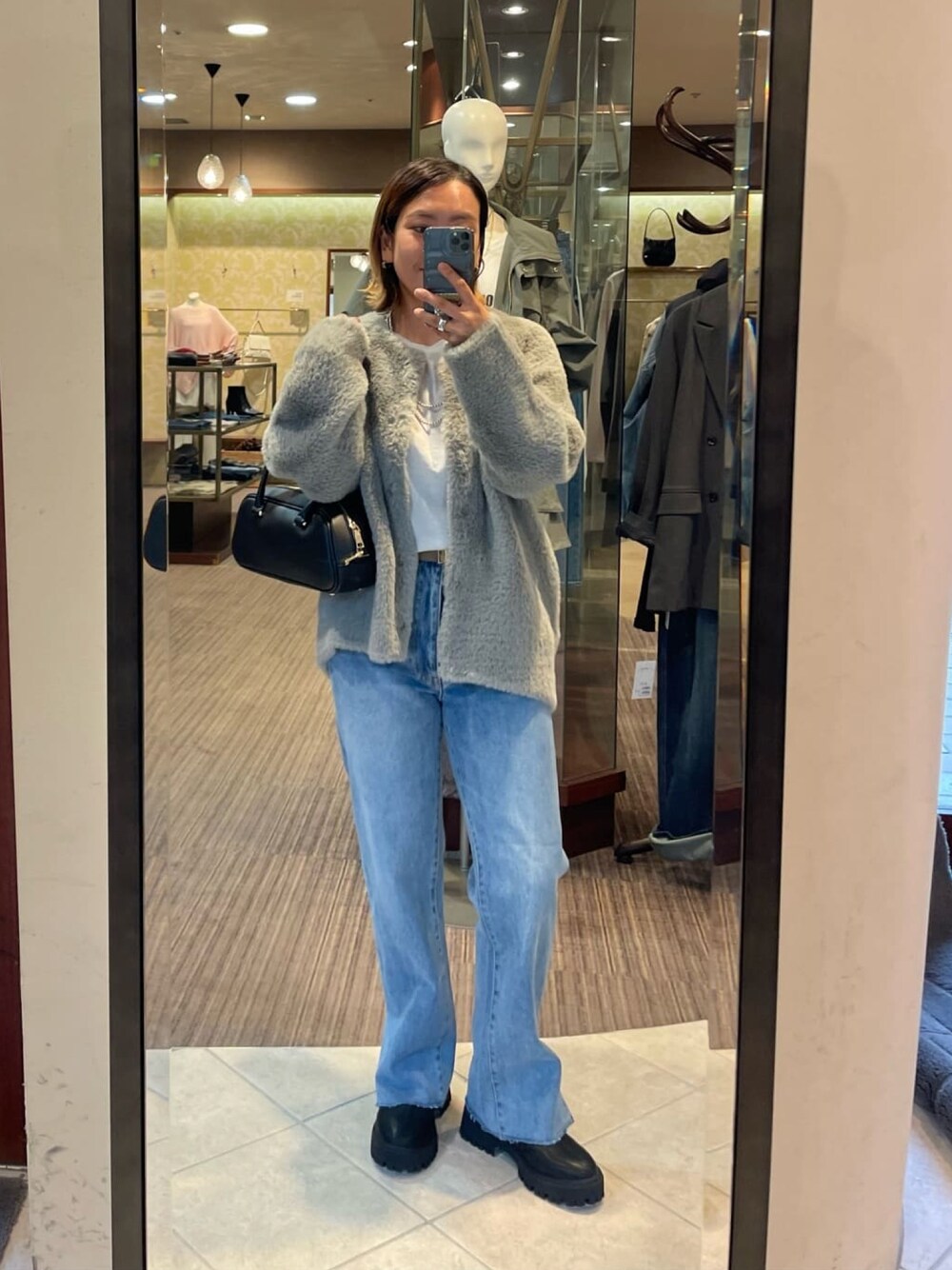 カーディガン フェイクファーのような滑らかな毛足が存在感たっぷりのミドル丈カーディガン。 滑らかなナイロンフェザーとストレッチ糸のダブルフェイス編みで程よい厚みがあり、秋口から初冬まで軽アウターとして着用できるアイテムです。 フロントはドットボタン仕様ですが、毛足に隠れて目立たないので着こなしの幅も広がりますす。 デニム 34サイズ着用 シンプルなストレートシルエットのデニムパンツ。 裾部分の外側にスリットを入れたデザインで、履くと少しフレアシルエットのように見えるので、脚のラインをキレイに見せてくれます。