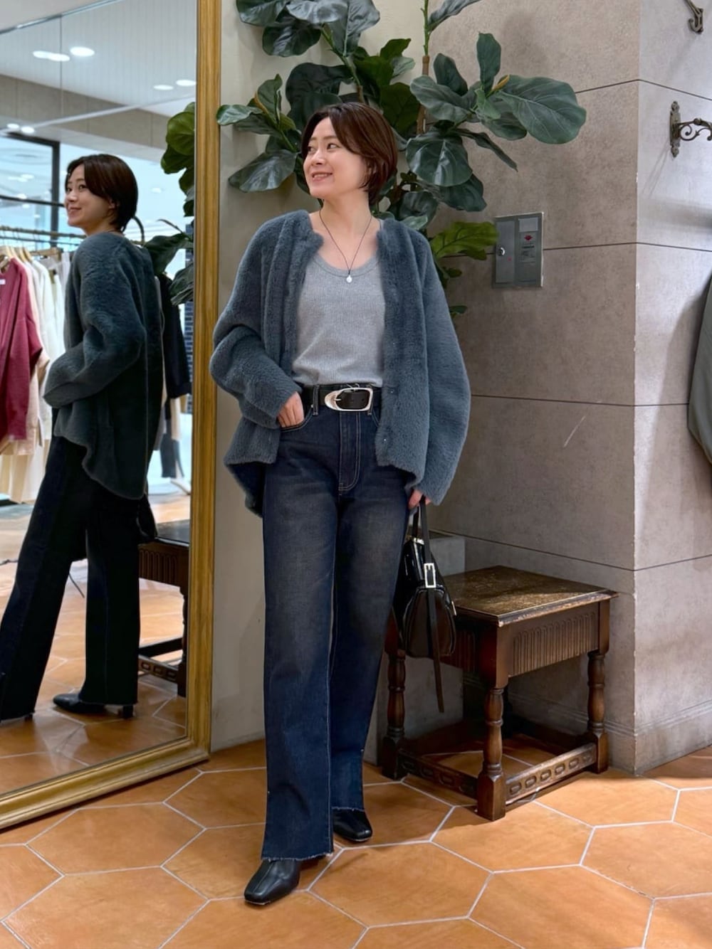 ・カーディガン フェイクファーのような滑らかな毛足が存在感たっぷりのミドル丈カーディガンです。程よく厚みがあり、秋口から初冬まで軽アウターとして着用できるアイテムです。 緩くカーブしたボリュームスリーブ、自然なバックテールヘムでこなれていながら着映えするデザインなのも魅力です。 ・デニム34サイズ着用。 シンプルなストレートシルエットのデニムパンツです。裾部分の外側にスリットを入れたデザインで、履くと少しフレアシルエットのように見えるので、脚のラインをキレイに見せてくれます。サイズ感は通常のサイズ感よりも大き目の作りになっていますので、1サイズ小さなサイズを選んでいただくと、ジャストウエストですっきりと履いていただけます。