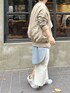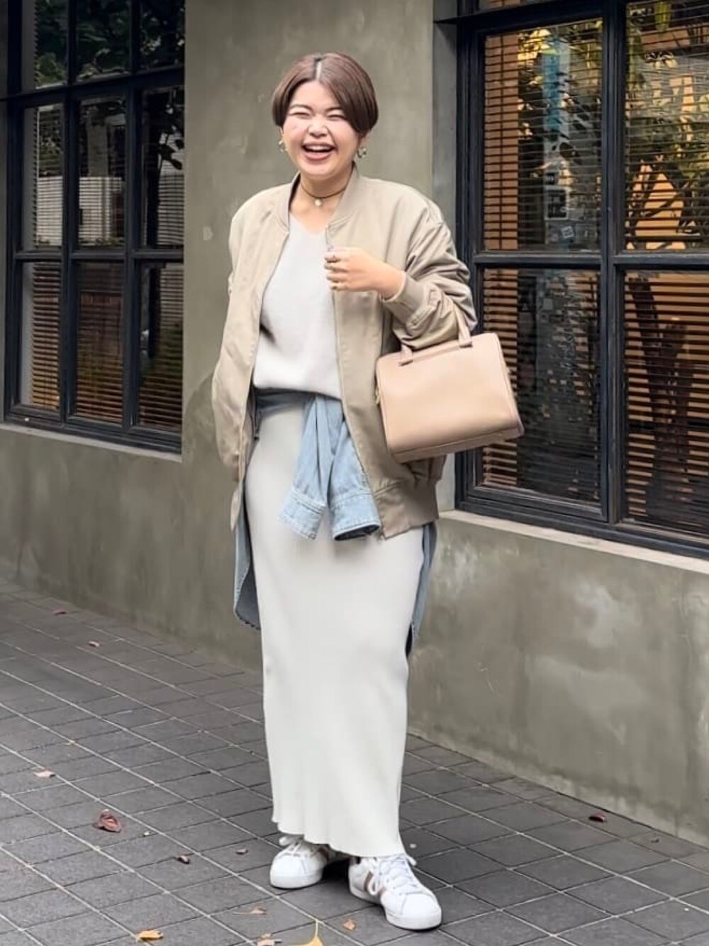 秋の淡色コーデ! 温かみのあるベージュはオシャレに見えるし、簡単に女っぽく着れます! スニーカーやデニムシャツで外すのもポイント!