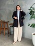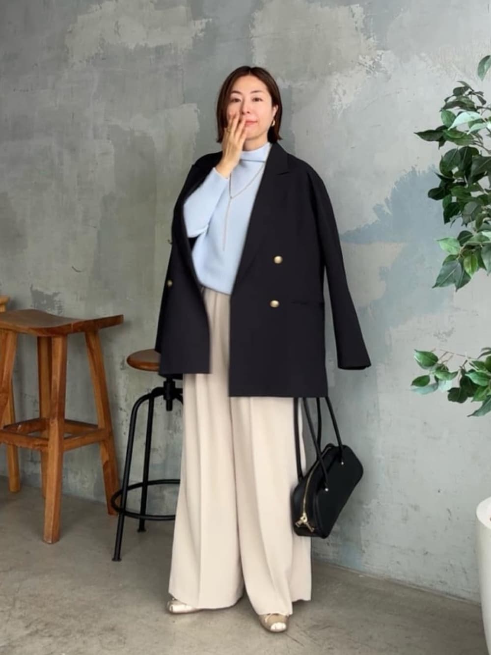 ●ジャケット こなれ感のあるゆったりシルエット。軽くてオンオフの着回しも楽しめる、秋の必須アイテムです。 ●ニット 定番ニットがリニューアルして登場。ボトルネックなので、ジャケットやコートを選ばず使えます。 ●パンツ ゆったり履けて、サス付きのお洒落見えデザイン。裏地もあり透け感なく履けるのも嬉しいです。 ◎ブルーを主役にしたきれいめジャケットコーデ。お仕事コーデにもおすすめです。