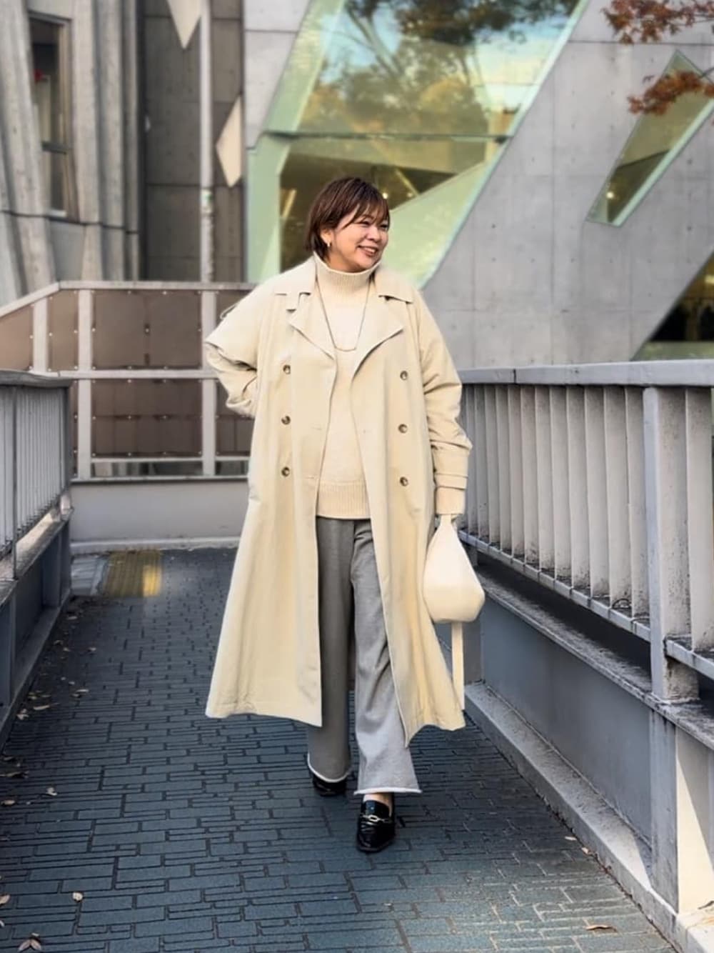 紅葉コーデいかがですか? ニット×スウェットパンツに トレンチコート。 楽ちんパンツに 着丈長めのニット! 紅葉が映えるよー!パンツは38サイズを着用してます。