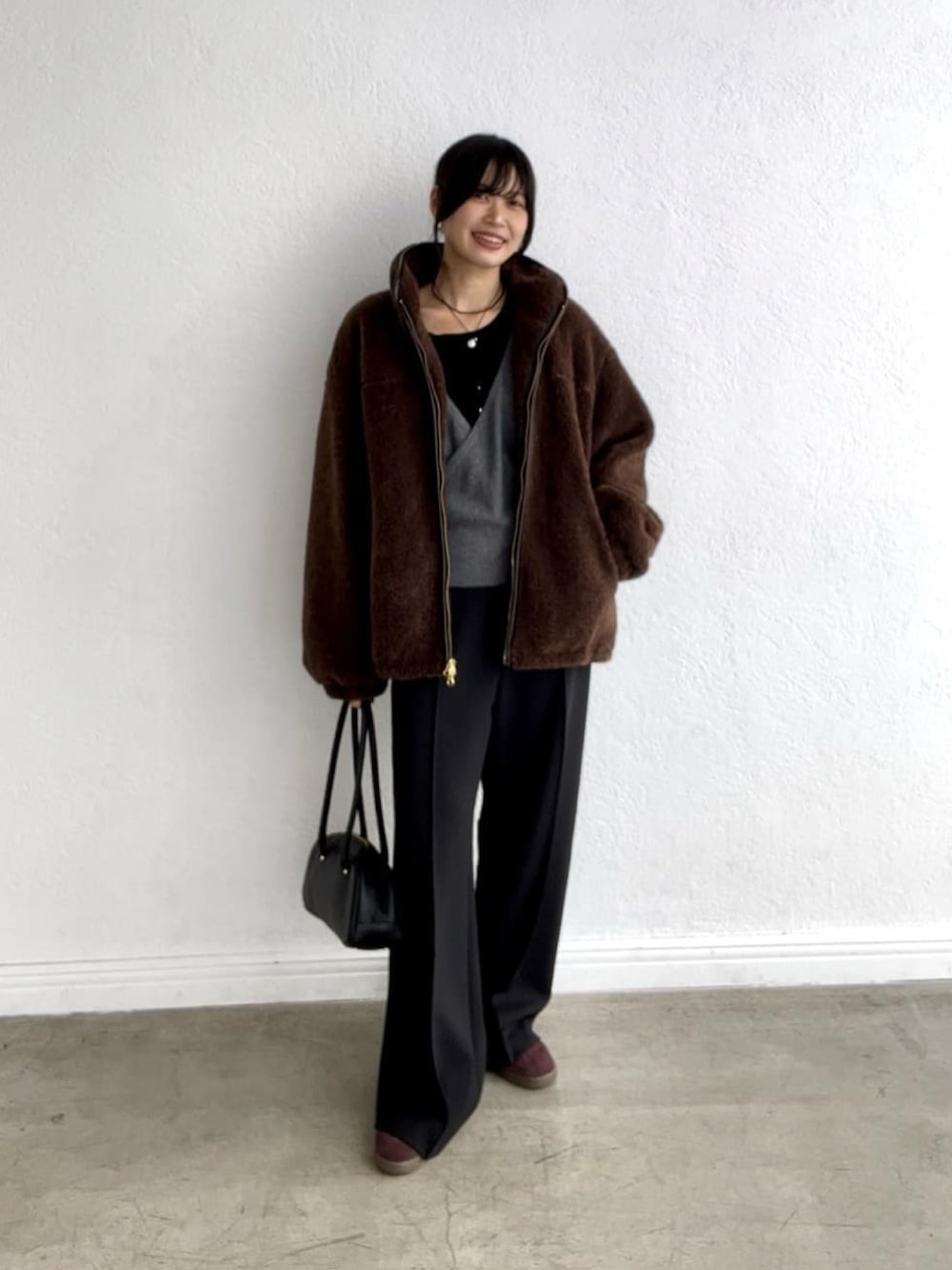 カシュクールニットの甘すぎないコーデ すっきりと着れるニットはジャストなサイズ感で 小柄さんにもおすすめ。 程よく女性らしくコーデのポイントになってくれます。 ダンボールパンツは38サイズ着用。 ウエストゴムで止まってくれるので大きすぎないサイズ感です。センタープレスで大人な雰囲気に。 ボアコートは軽くて暖かいので、サッと羽織に便利。 合わせるアイテム次第でカジュアル過ぎずに着れます。