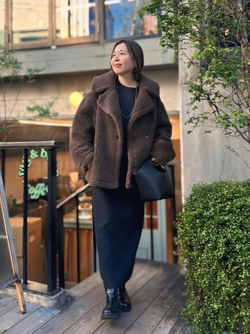 ●コート 落ち着いたブラウンカラーのボアコート。着映えるボア素材はコーデの羽織るだけで主役に! ●ニット コットンニットは肌触りよく長いシーズン使えます。インせずバランスの良いシルエット、着心地も◎です。 ●スカート 38サイズ着用。ゴムウエストで楽ちん。体型拾わずゆったりとしたシルエット。 ◎きれいめカジュアルなセットアップコーデ。ネイビー×ブラウンのカラー合わせもおすすめです。