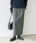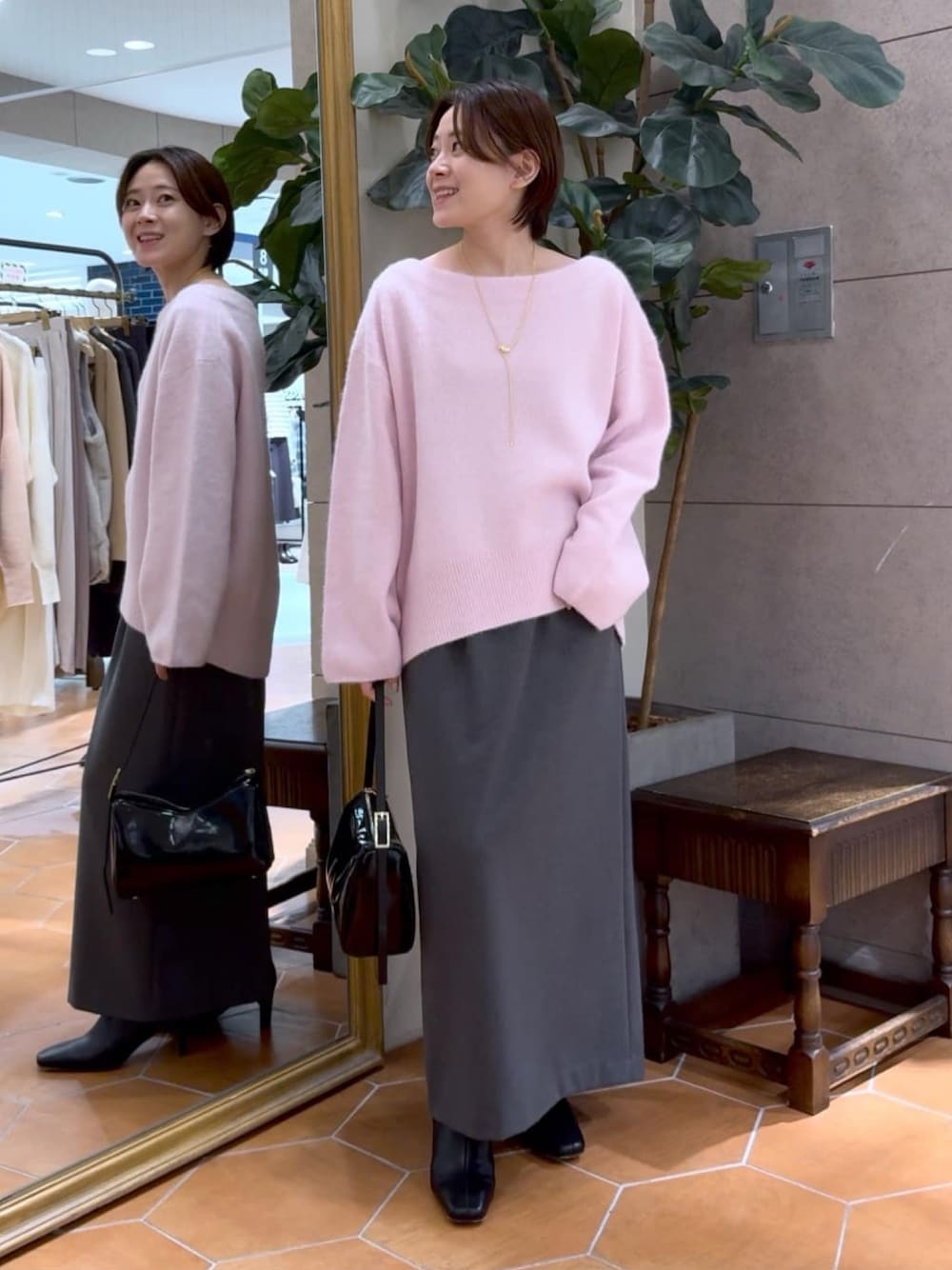 ・ニット へアリーな糸を使用したボートネックのニットです。毛足のある華やかな印象の編地で、触り心地も◎デコルテが綺麗にみえる衿ぐりで、袖口もゆったりとさせることで自然に抜け感を出してくれます。長すぎない着丈にすることで、タイトスカートとバランスがとりやすいシルエットに。 全体的にゆるっとした着心地ですが華奢で女性らしい印象にしてくれるニットです。 ・スカート 36サイズ着用。 ウエストの程よいギャザーと縦長シルエットで、履き心地よく、すっきりキレイ見えするタイトスカートです。体のラインがすっきり見えつつ、体型カバーもしてくれるデザインになっております。