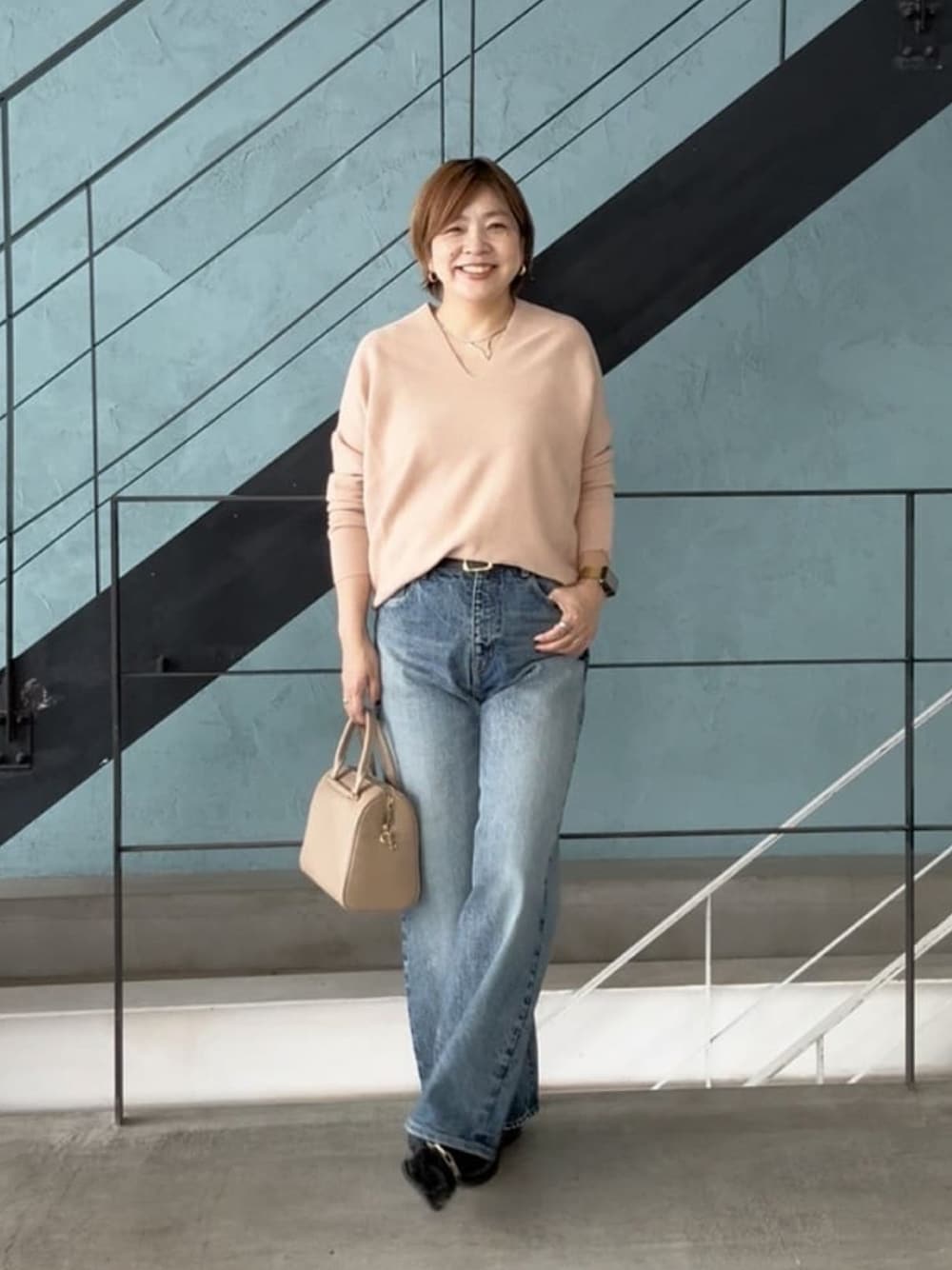 サーモンピンクニットが 女性らしい色合い。 デニム合わせが 可愛いのにカッコよく着れるよ!