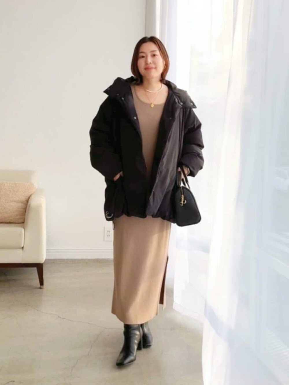●アウター 撥水機能もついたダウンコート。長めなミドル丈でかなり暖かいです! ●ワンピ 38サイズ着用。柔らかなニット素材でリラクシーな着心地です。 ◎きれいめに着るダウンコーデ。カジュアルすぎない女性らしいシルエットのダウンが主役です。