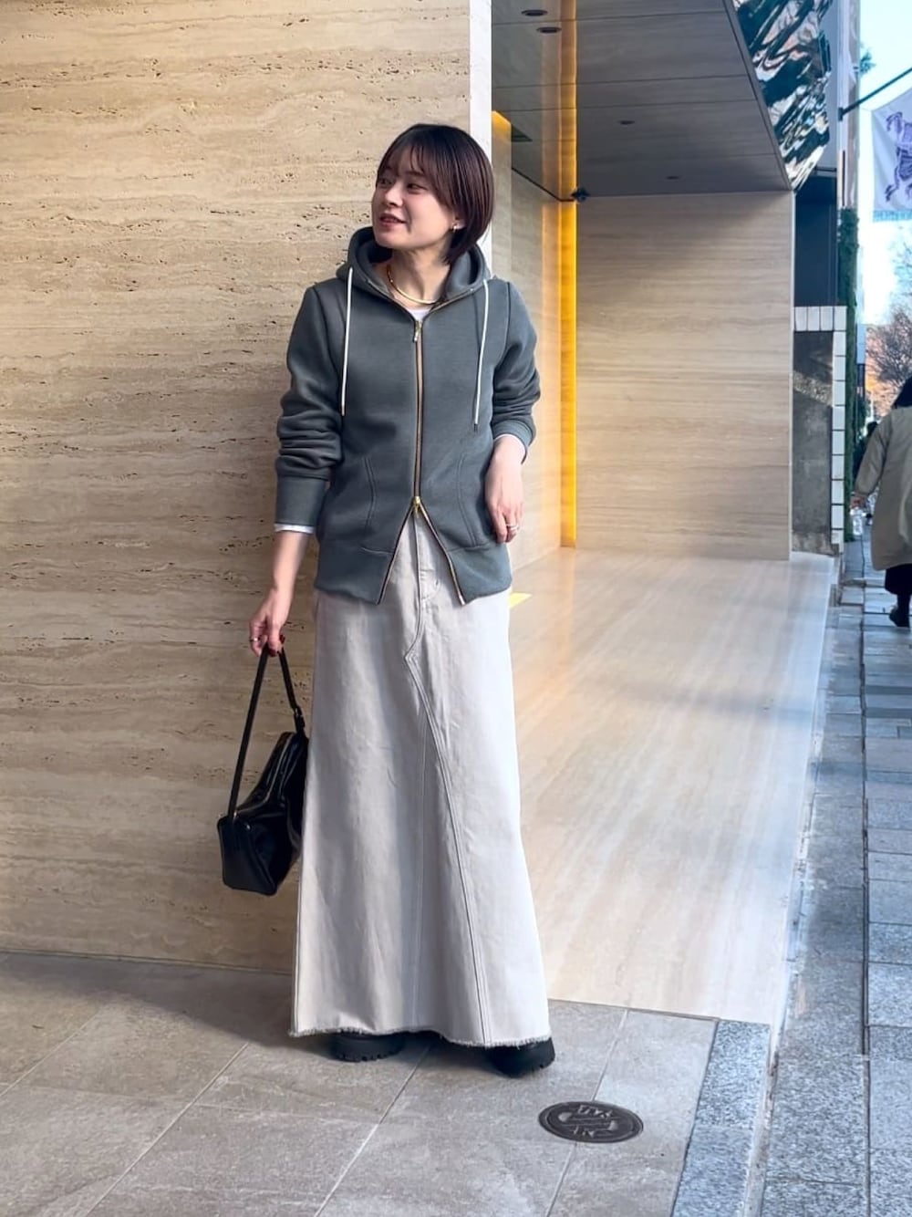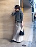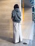 ・パーカー 長袖のスッキリシルエットと上品な生地感がきれいめカジュアルによく合うパーカーです。 生地に膨らみのあるフードデザインで、顔周りに自然で華やかなボリューム感を演出します。 軽量なので肩が凝らず持ち運びにも便利、ボトムスを選ばないミドル丈なので、何にでも合わせやすく着回し力抜群です。ヒップが半分くらい隠れる着丈でコンパクトで安心感のあるアイテムです。 ・スカート34サイズ着用。 控え目なマーメイドシルエットのマキシ丈スカートです。取り外し可能なサスペンダー付きがコーデのワンポイントになりお洒落です。マーメイドシルエットによって腰回りすっきり見せてくれるアイテムです。34サイズのウエストはベルトを使って腰で止まってくれます。着丈は 36サイズとそんなに変わらないですが、ウエストとヒップ周りの収まりが良いです。