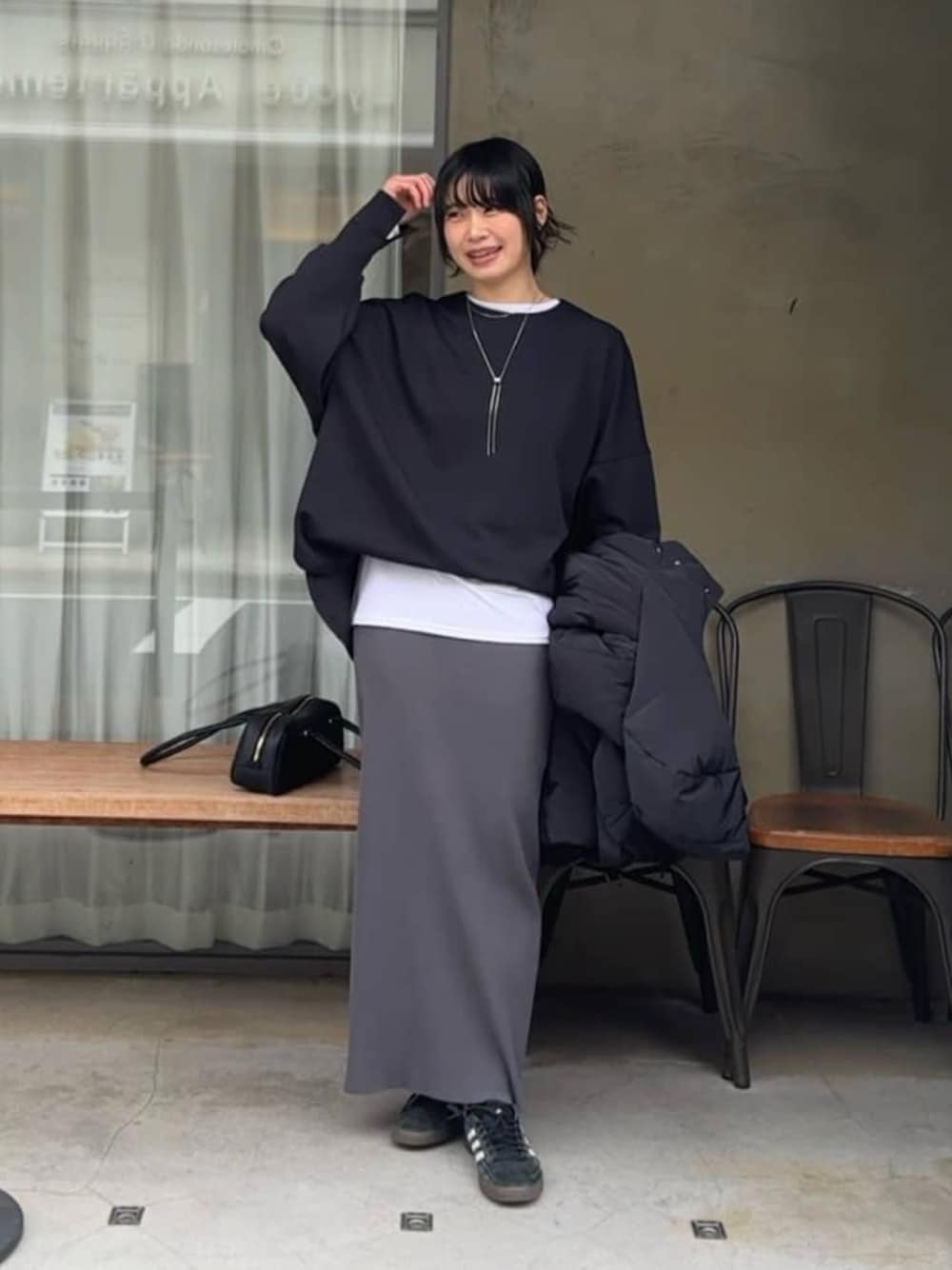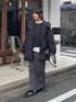 シンプルモノトーンコーデ ダンボールポンチョプルオーバーに、新色のブラックが登場! ゆったりとした着心地、程よく厚みのあるもちもち素材でロングシーズン活躍します。 インナーにシアーベロアロンTを着用。ベルトを締めてダンボールポンチョを中に入れ込んでいます。 スカートはチャコールグレーの38サイズ。しっかりマキシ丈で履きたい方は38サイズ、すっきり見え重視の方は36サイズを少し落として履くのが個人的におすすめです。