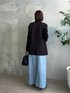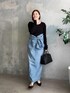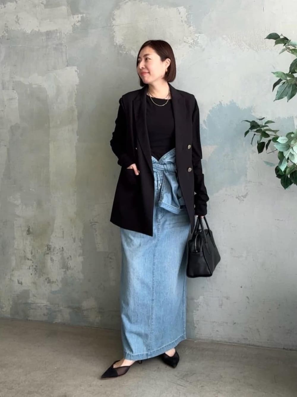 ●ワンピ ブルーFサイズ着用。よっしーさんコラボのシャツワンピ。柔らかなデニム素材で肌あたりも軽さも着心地抜群です。腰巻きアレンジもおすすめ。 ●インナー きれいめ見えするロンTは、ネックラインがすっきりしていて上品な印象に。 ◎シャツワンピをきれいめカジュアルに。シックなブラックカラーときちんと感のある小物合わせがポイントです。